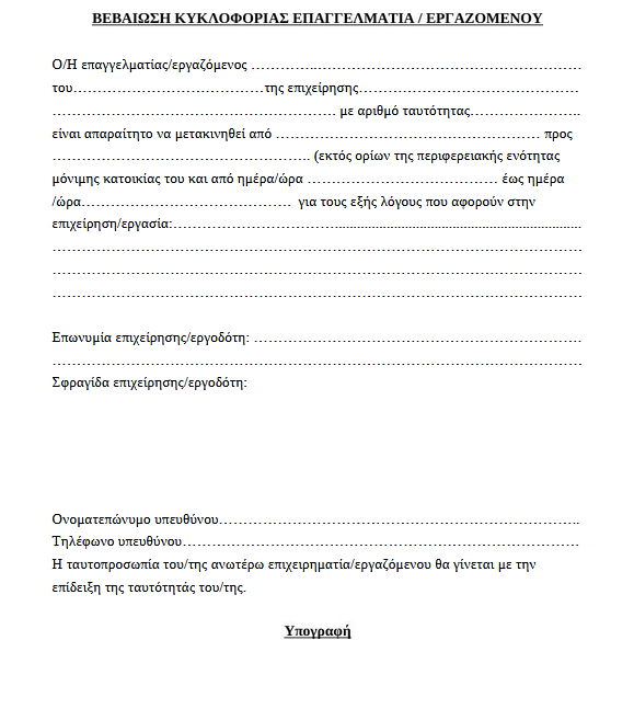 Για τις μετακινήσεις των επιχειρηματιών και των εργαζομένων τους, εκτός νομού Κορινθίας, για επαγγελματικές ανάγκες, είναι απαραίτητη η συμπλήρωση της παρακάτω βεβαίωσης.