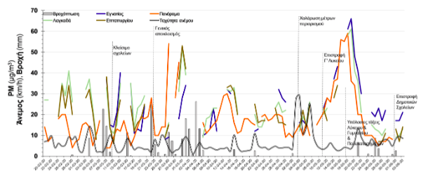 Σύμφωνα με μελέτη του Εργαστηρίου στον αστικό ιστό της Ελλάδας (Αθήνα, Θεσσαλονίκη, μεγάλες πόλεις) καταγράφηκε μια μείωση στα αιωρούμενα σωματίδια κατά τη διάρκεια του lockdown, αλλά σημειώνεται μια επαναφορά σε υψηλότερα επίπεδα ιδιαίτερα κατά τη διάρκεια της διαδικασίας άρσης των μέτρων αποκλεισμού τον Μάϊο. Στο παρακάτω σχήμα φαίνεται η χρονική διακύμανση των συγκεντρώσεων αιωρούμενων σωματιδίων σε διαφορετικούς σταθμούς μέτρησης στη μητροπολιτική περιοχή της Θεσσαλονίκης από την έναρξη της πανδημίας στη χώρα μέχρι σήμερα.