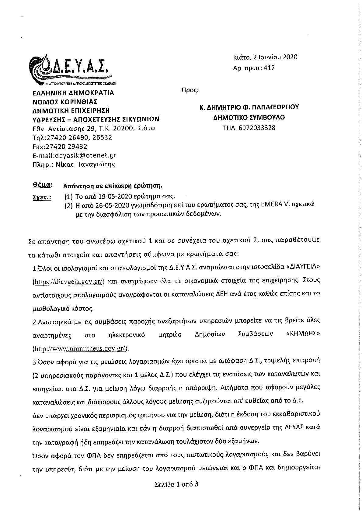 Στο πρόσφατο άρθρο μας με τίτλο Με ερωτήσεις… “έκπληξη” ο κ. Δ. Παπαγεωργίου, ταράζει τα “πηγαία” νερά του Δήμου Σικυωνίων, και ξαφνικά κατάφερε να αναζωπυρώσει το πολιτικό ενδιαφέρον. (δείτε ΕΔΩ) αναφερθήκαμε ευθέως, στην έκπληξη και τον προβληματισμό που μας δημιούργησε η αντιπολιτευτική κίνηση του επικεφαλής της ελάσσονος μειοψηφίας του Δήμου Σικυωνίων κ. Δημήτρης Παπαγεωργίου, καταθέτοντας ερωτήσεις με αποδέκτες τους αντίστοιχους διευθυντές των υπηρεσιών-επιχειρήσεων του Δήμου. Επίσης προβλέψαμε πως οι απαντήσεις που θα δοθούν, θα έχουν πολύ μεγάλο ενδιαφέρον, ουσιαστικό και πολιτικό. Στις 2 Ιουνίου, θα λέγαμε σχετικά γρήγορα αναλογιζόμενοι τον μεγάλο όγκο των ερωτημάτων, η ΔΕΥΑΣ έδωσε την έγγραφη απάντηση της προς τον κ. Δ. Παπαγεωργίου. (ακολουθεί το έγγραφο)