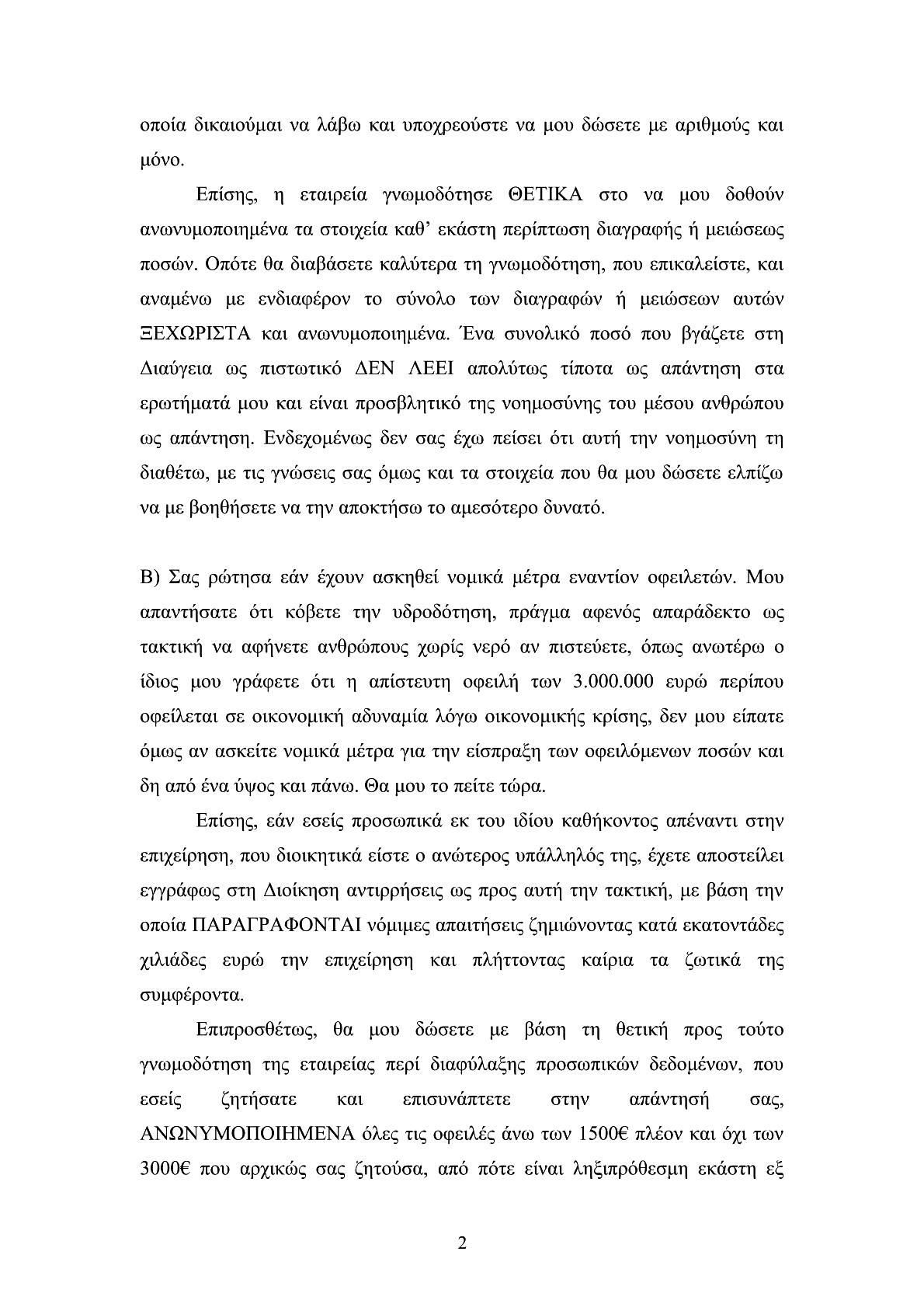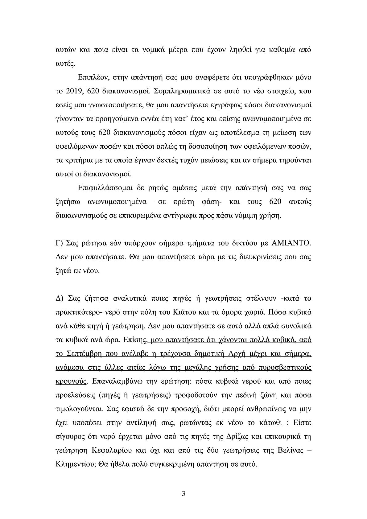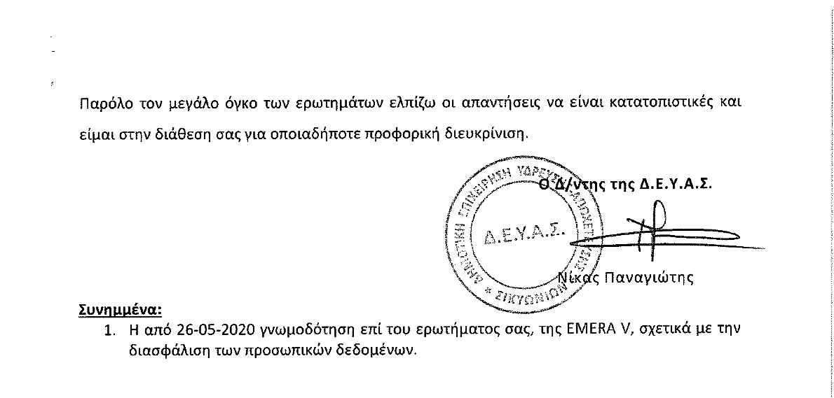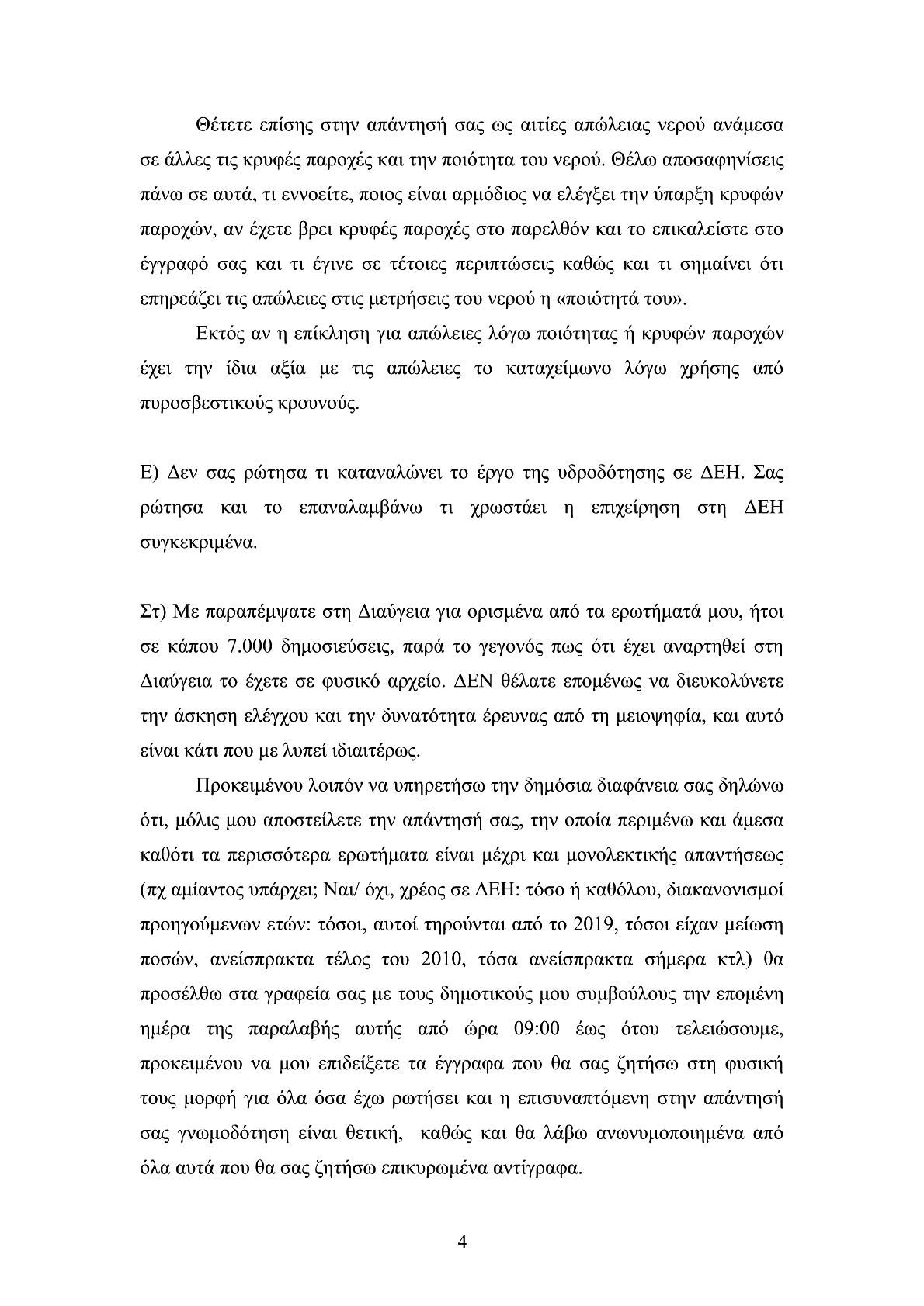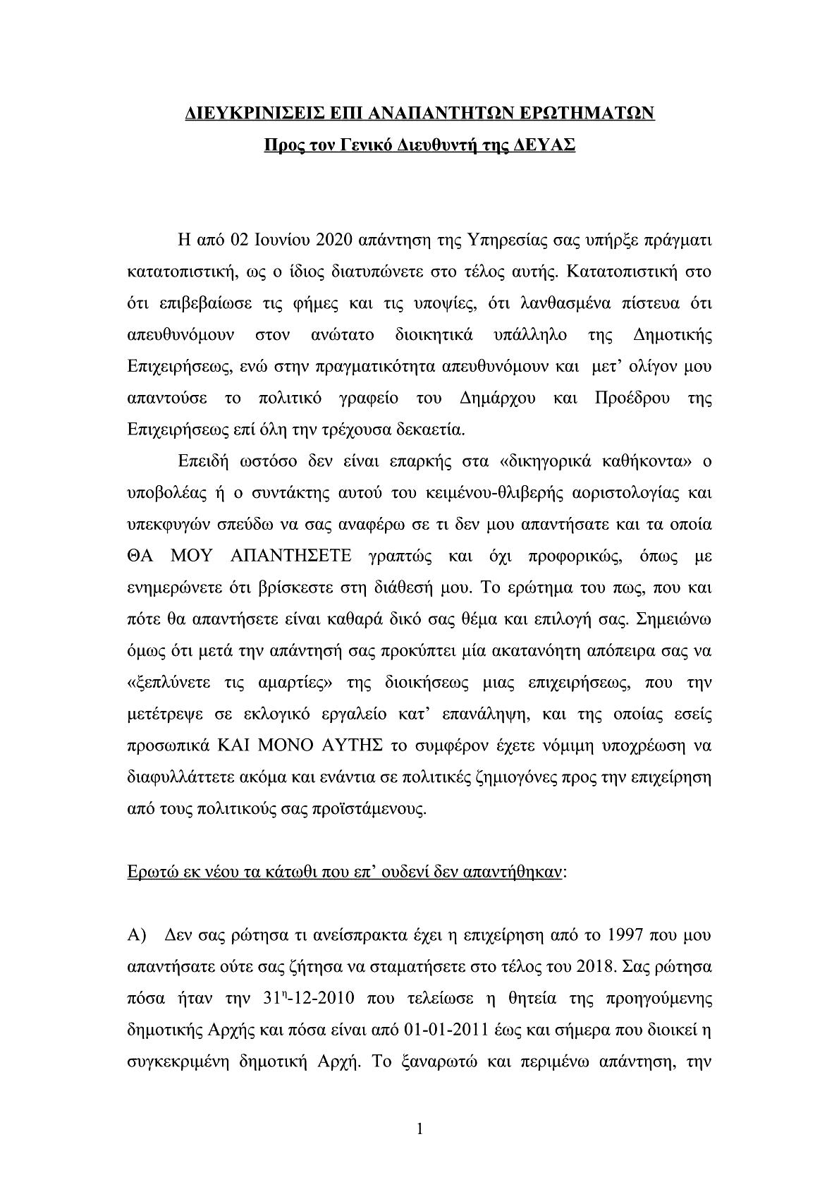 δηλαδή σαν “προειδοποιητικές βολές”. Θα μπορούσαμε να λέγαμε πως η απάντηση του διευθυντή της ΔΕΥΑΣ κ. Π. Νίκα, εξόργισε τον κ. Δ. Παπαγεωργίου που επανήλθε άμεσα ζητώντας έγγραφες διευκρινίσεις επί, όπως αναφέρει, αναπάντητων ερωτημάτων του, καυτηριάζει με σκωπτικό τρόπο την “κατατοπιστική” απάντηση του κ. Π. Νίκα και μιλά για φήμες που επιβεβαιώθηκαν σχετικά με τον “πολιτικό” ρόλο της Δημοτικής επιχείρησης, χαρακτηριστικά αναφέρει: «Θλίβομαι διότι διαπιστώνω ότι κάποιοι υψηλόβαθμοι υπηρεσιακοί παράγοντες δεν έχουν συνηθίσει στην παροχή συνδρομής στο αντιπολιτευτικό έργο στο Δήμο μας, ενώ το ιερό καθήκον τους είναι η προστασία του Δήμου και όχι των πολιτικών επιλογών των διοικήσεων αυτού». Η συνέχεια (όχι μόνο της συγκεκριμένης ερώτησης) του αντιπολιτευτικού τρόπου που επέλεξε ο κ. Παπαγεωργίου, αναμένεται με έντονο ενδιαφέρον (εκκρεμεί απάντηση από την οικονομική υπηρεσία του Δήμου) για την διάρκεια, τ΄αποτελέσματα, την πολιτική αντιπαράθεση και την ουσιαστική ανταπόκριση του αυτοδιοικητικού προσωπικού.