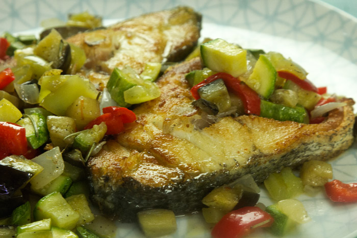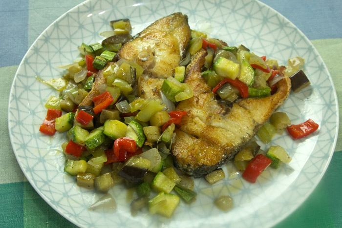 Η συνταγή προέρχεται απ’ τη Γαλλία και είναι εξαιρετικά απλή και ταυτόχρονα, εντυπωσιακά νόστιμη. Μια συνταγή πανεύκολη που θα σας πάρει μισή ώρα συνολικά. Ιδανική για ψάρι σε φέτες. Προφανώς μπορείτε να κάνετε παραλλαγές με τα υλικά της ρατατούιγ, παίζοντας ειδικά με πολύχρωμες πιπεριές. Στην ουσία πρόκειται για δύο παράλληλες παρασκευές σε δυο τηγάνια. Στο ένα τηγάνι σοτάρονται και μελώνουν για ένα 20λεπτο ανάμεικτα λαχανικά κομμένα σε μικρά κυβάκια, που τα ονοματίζουμε ρατατούιγ, μια και προσομοιάζουν στο αντίστοιχο Γαλλικό πιάτο. Στο άλλο τηγάνι ψήνονται σε λίγο λάδι οι φέτες του κρανιού για ένα 5λεπτο. Και η σύνθεση των δύο γίνεται στο πιάτο.