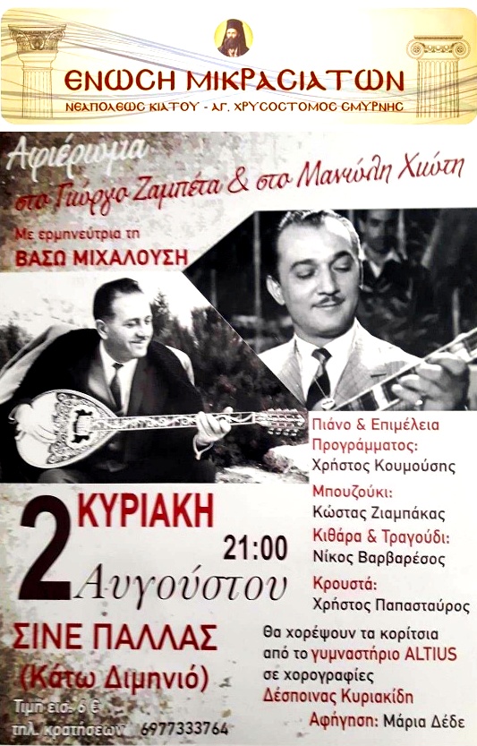 Η Ένωση Μικρασιατών Νεαπόλεως Κιάτου Κορινθίας διοργανώνει την Κυριακή 2 Αυγούστου, αφιερωματική βραδιά στον Γιώργο Ζαμπέτα και τον Μανώλη Χιώτη, στους δύο μεγάλους συνθέτες που τίμησαν το τετράχορδο μπουζούκι και έγραψαν τραγούδια που έμειναν στην ιστορία, τόσο για τις ξεχωριστές τους μελωδίες όσο και γιατί πέρασαν μέσα από τη μικρή μας οθόνη, μέσω του ελληνικού κινηματογράφου που άφησαν εποχή.