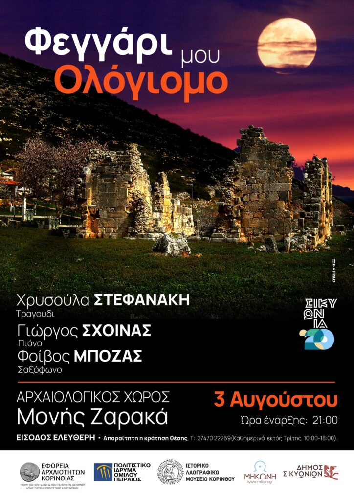 Η Εφορεία Αρχαιοτήτων Κορινθίας (ΕΦ.Α.ΚΟΡ.), το Πολιτιστικό Ίδρυμα Ομίλου Πειραιώς (ΠΙΟΠ), το Ιστορικό Λαογραφικό Μουσείο Κορίνθου (Ι.Λ.Μ.Κ.) και το ΝΠΔΔ Παιδείας Αθλητισμού και Πολιτισμού του Δήμου Σικυωνίων «Η Μηκώνη», συνδιοργανώνουν μουσική εκδήλωση αφιερωμένη στην Πανσέληνο του Αυγούστου. Τη Δευτέρα 3 Αυγούστου (ώρα 21:00) μια ξεχωριστή βραδιά με αγαπημένα τραγούδια και φόντο τον εμβληματικό αρχαιολογικό χώρο της Μονής Ζαρακά, στη Στυμφαλία.
