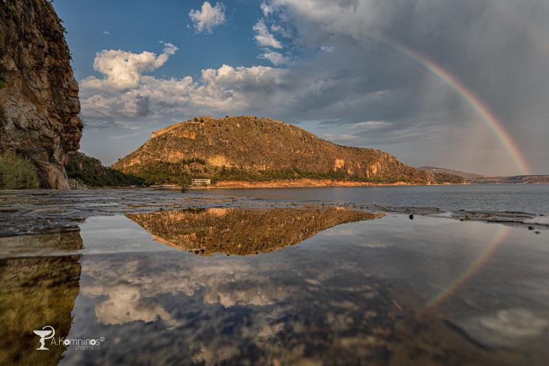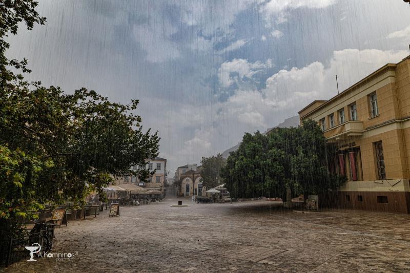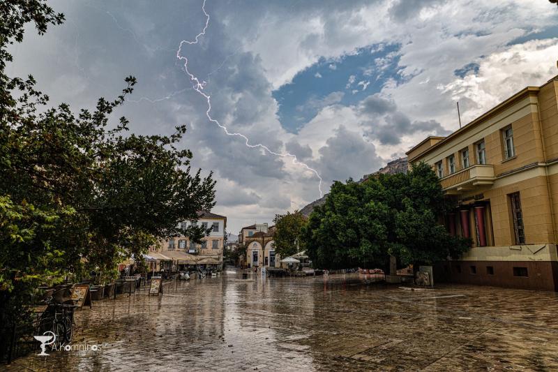 Και ενώ ο κόσμος αναζητούσε καταφύγιο από την ξαφνική καταιγίδα, ο Θάνος Κομνηνός δεν έχασε την ευκαιρία και βγήκε στα μουσκεμένα σοκάκια για να αποτυπώσει με τον φακό του το ιδιαίτερο για την εποχή σκηνικό, περνώντας μέσα από τις εικόνες του μία θα λέγαμε πιο …καλλιτεχνική σκοπιά της βροχής. Κεραυνοί στον Αναπλιώτικο ουρανό, μία Πλατεία Συντάγματος άδεια εν μέσω επίμονης νεροποντής, τα νερά της βροχής που καθρεπτίζουν τα τείχη πάνω από τον Προμαχώνα Πέντε Αδέλφια και τέλος το πολύχρωμο ουράνιο τόξο με φόντο την παραλία της Αρβανιτιάς.