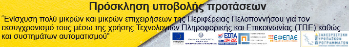 Πρόσκληση υποβολής προτάσεων χρηματοδοτικής ενίσχυσης επενδυτικών σχεδίων για τη δράση 2.b.2.3 “Ενίσχυση πολύ μικρών και μικρών επιχειρήσεων της Περιφέρειας Πελοποννήσου για τον εκσυγχρονισμό τους μέσω της χρήσης Τεχνολογιών Πληροφορικής και Επικοινωνίας (ΤΠΕ) καθώς και συστημάτων αυτοματισμού” στα πλαίσια του Επιχειρησιακού Προγράμματος «ΠΕΛΟΠΟΝΝΗΣΟΣ 2014-2020».