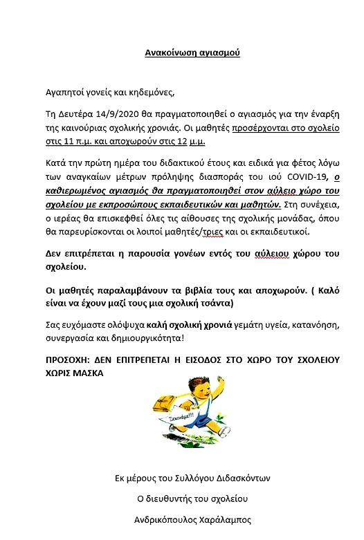 Μετά από τα πολλά μπρος-πίσω της ημερομηνίας έναρξης της καινούριας σχολικής χρονιάς, η 14η Σεπτεμβρίου έφτασε. Γεγονός είναι ότι υπάρχει διάχυτη σύγχυση στην σχολική κοινότητα και στην κοινωνία λόγω των αναγκαίων μέτρων πρόληψης διασποράς του κορωναϊού, κάτι το υποχρεωτικό της χρήσης μάσκας, κάτι τα παγουρίνια, κάτι περί εξωτερικών χώρων χωρίς συνωστισμό, κάτι τα διαλείμματα και πολλές ακόμη λεπτομέρειες, καθιστούν την έναρξη της σχολικής χρονιάς “περιπετειώδες”. Ο διευθυντής δημοτικού σχολείου Βραχατίου, κ. Ανδρικόπουλος Χαράλαμπος, εξέδωσε ανακοίνωση για τον αγιασμό της προσεχής Δευτέρας δίνοντας ξεκάθαρα την εικόνα της μέρας του αγιασμού. Προφανώς με ψυχραιμία και υπομονή, μακριά από ιδεοληψίες, η φετινή σχολική χρονιά χαρακτηρίζεται από πρωτόγνωρα προς όλους γεγονότα, αλλαγές συνηθειών, δυσκολία προσαρμοστικότητας σε νέα δεδομένα, αβεβαιότητα σε πολλά επίπεδα που μόνο με πνεύμα συνεργατικότητας από όλες τις εμπλεκόμενες μεριές, θα υπάρξει η δυνατότητα μιας παραγωγικής και εκπαιδευτικής χρονιάς.