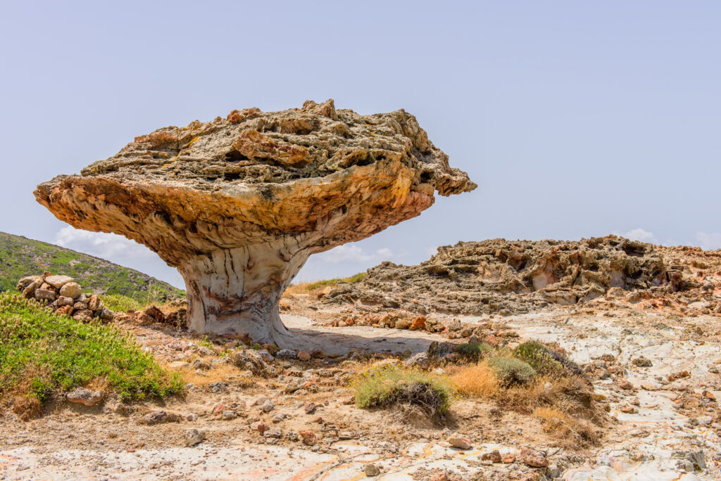 Στο βορειοδυτικό τμήμα της Κιμώλου, στα δυτικά του υψώματος «Σκλάβος», υπάρχει ένα τεράστιο πέτρινο μανιτάρι που οι κάτοικοι το ονομάζουν «Σκιάδι». Αποτελεί ένα μνημείο της φύσης που βρίσκεται στη μέση ενός γυμνού πλατώματος με υπέροχη θέα, καθώς αγκαλιάζει τις νοτιοδυτικές και δυτικές ακτές του νησιού κι ένα μεγάλο μέρος της Μήλου. Το «Σκιάδι» οφείλει τη δημιουργία του στα διαφορετικά πετρώματα που το αποτελούν και στους ισχυρούς ανέμους που φυσούν στην περιοχή του. Το πιο μαλακό πέτρωμα, που βρίσκεται στη βάση, προσβάλλεται και διαβρώνεται από τον άνεμο που μεταφέρει σκόνη ή κόκκους άμμου. Αποτέλεσμα της διεργασίας της «απορρίνισης», όπου η βάση «τρώγεται» και στενεύει συνεχώς, ενώ η κορυφή όντας πιο σκληρή παραμένει σχεδόν άθικτη, είναι και το πανέμορφο γλυπτό της Κιμωλιάτικης φύσης, το «Σκιάδι».