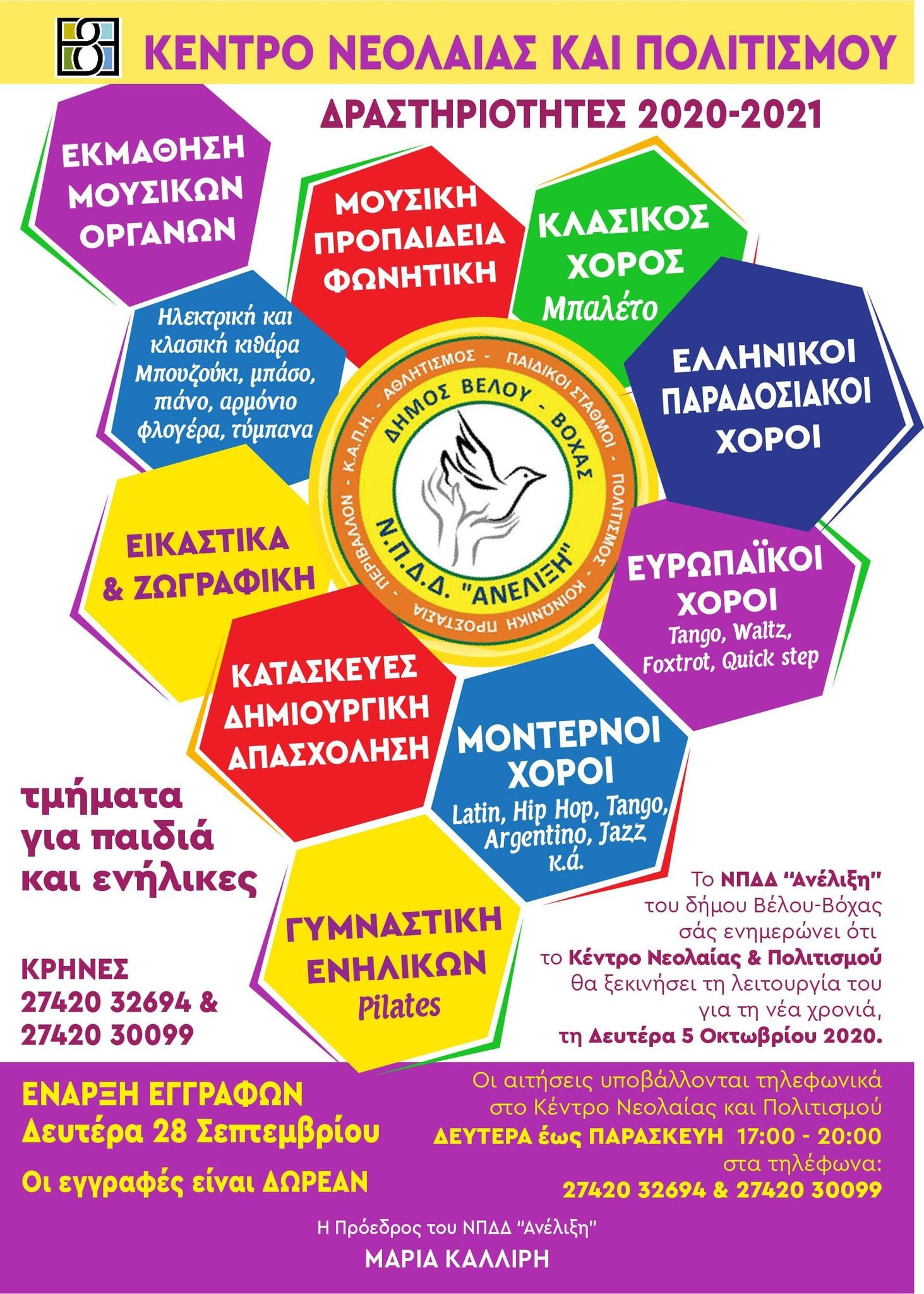 Την Δευτέρα 28 Σεπτεμβρίου ξεκίνησαν οι εγγραφές στο Κέντρο Νεολαίας και Πολιτισμού του Δήμου Βέλου Βόχας. Θα διδάσκονται: μουσικά όργανα, μουσική προπαιδεία-φωνητική, κλασικός χορός-μπαλέτο, ελληνικοί & παραδοσιακοί χοροί, ευρωπαϊκοί & μοντέρνοι χοροί, latin χοροί, γυμναστική ενηλίκων (pilates), κατασκευές- δημιουργική απασχόληση, εικαστικά & ζωγραφική, ηλεκτρική και κλασική κιθάρα (μπουζούκι, μπάσο, πιάνο, αρμόνιο, φλογέρα, τύμπανα).