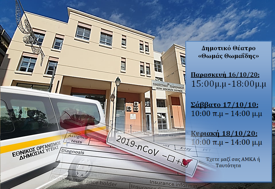 Στα πλαίσια ελέγχου και πρόληψης του Covid-19 ο Δήμαρχος Κορινθίων Βασίλης Νανόπουλος, μετά από σχετική συνεννόηση, παραχώρησε σε κλιμάκιο του ΕΟΔΥ χώρο στο Δημοτικό Θέατρο Κορίνθου προκειμένου να πραγματοποιηθούν ,σε πολίτες που το επιθυμούν, διαγνωστικά test covid-19 . Οι πολίτες που θα προσέλθουν θα πρέπει να έχουν μαζί τους είτε τον αριθμό ΑΜΚΑ τους είτε τον αριθμό Δελτίου Αστυνομικής Ταυτότητας.
