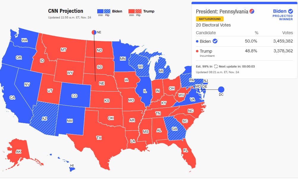 «Σήμερα,το υπουργείο Εσωτερικών της Πενσιλβάνιας επικύρωσε τα αποτελέσματα των εκλογών της 3ης Νοεμβρίου για τον πρόεδρο και τον αντιπρόεδρο των Ηνωμένων Πολιτειών Όπως απαιτείται από την ομοσπονδιακή νομοθεσία,υπέγραψα το Πιστοποιητικό Διαπίστωσης για τη λίστα των εκλεκτόρων του Τζο Μπάιντεν και της Κάμαλα Χάρις» ανέφερε μέσω του Twitter ο Δημοκρατικός κυβερνήτης της Πολιτείας,Τομ Γουλφ.