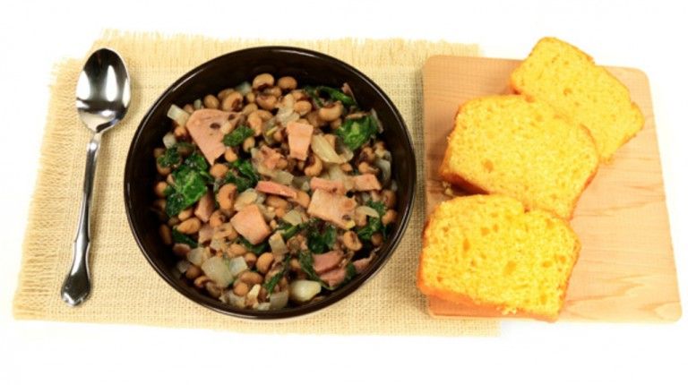 Μαυρομάτικα φασόλια,λαχανίδες και καλαμποκόψωμο του Αμερικανικού Νότου.Στα νότια των ΗΠΑ πιστεύουν ότι τίποτα δεν προσκαλεί καλύτερα την καλή τύχη από την ταπεινότητα,γι αυτό τη μέρα της Πρωτοχρονιάς αφήνουν στην άκρη τα πλούσια γεύματα και βάζουν στο πιάτο τους μαυρομάτικα φασόλια και λαχανίδες.Επιπλέον,αυτή τη μέρα τιμούν και το ψωμί που φτιάχνεται με καλαμποκάλευρο,καθώς πιστεύουν ότι το κίτρινο χρώμα του καλαμποκιού (που μοιάζει με τον χρυσό),φέρνει ευημερία το νέο έτος.