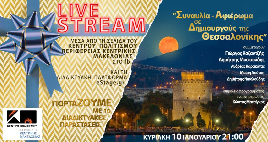Το Κέντρο Πολιτισμού Περιφέρειας Κεντρικής Μακεδονίας παρουσιάζει το εορταστικό του πρόγραμμα “γιορτάΖΟΥΜΕ” στην εποχή της πανδημίας.Τα live stream προβάλλονται μέσα από τη σελίδα του Κέντρου Πολιτισμού στο facebook και μέσα από την διαδικτυακή πλατφόρμα eStage.gr για όλους αυτούς που δεν διαθέτουν Facebook.