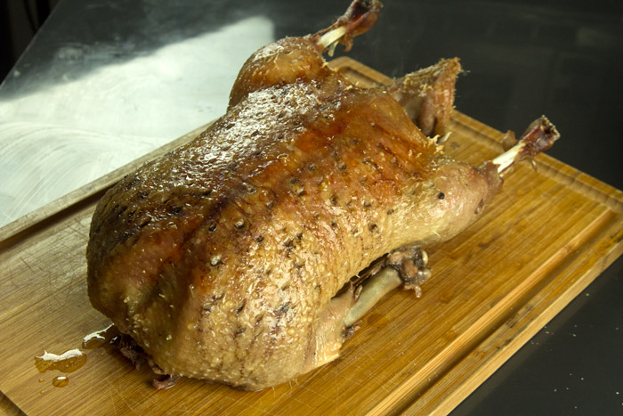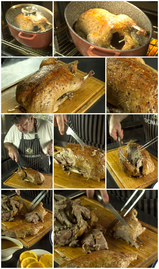 Η πάπια στα συγκεκριμένα κιλά,είναι έτοιμη στο δίωρο,σε λογική well done αλλά ζουμερή και με τη πέτσα τραγανή και το λίπος όλο να έχει λιώσει.Την βγάζετε απ’ τον φούρνο και την ακουμπάτε σε ξύλο κοπής,να αναπαυθεί για 10’ τουλάχιστον.Στη συνέχεια κόβετε και αφαιρείτε τα στήθη και τα πόδια.Τα στήθη τα κόβετε σε ροδέλες και σερβίρετε σε πιάτα.