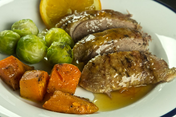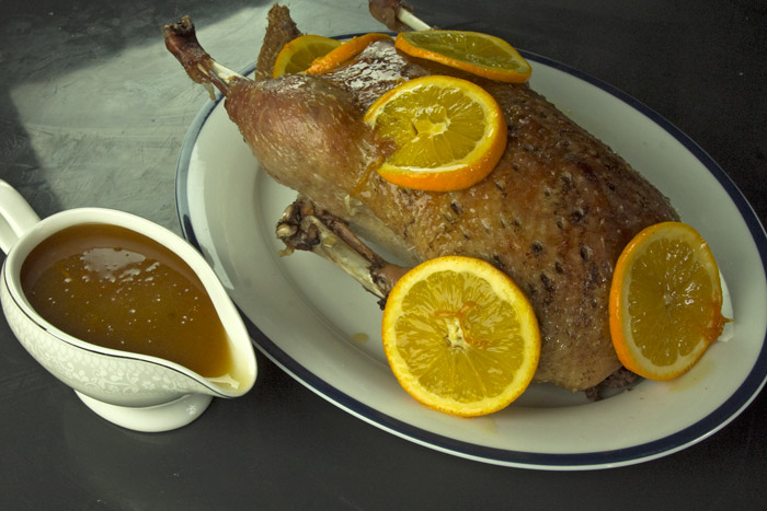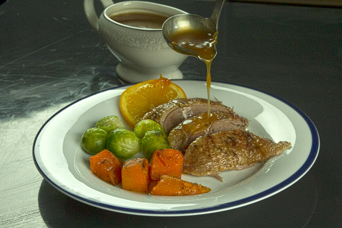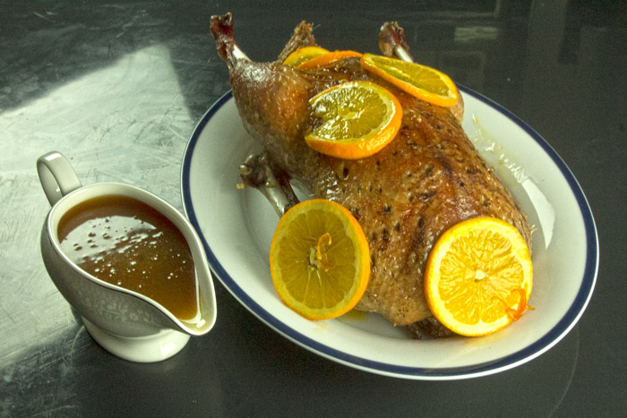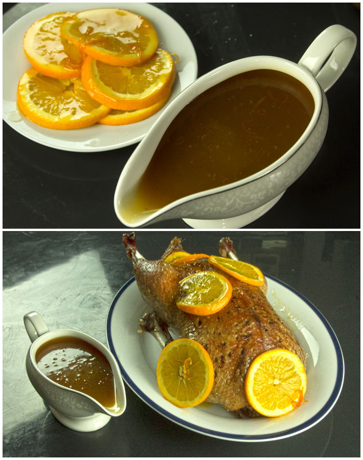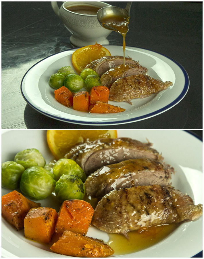 Αν και το στήθος της πάπιας είναι υπέροχο όταν ψήνεται medium rare,εδώ που έχουμε ολόκληρο το πτηνό η προσέγγιση είναι well done για να μπορούν να τρώγονται και το μπούτια.Επιπλέον είναι τεχνικά σχεδόν αδύνατον να πετύχεις το ιδανικό medium rare ψήσιμο στο φούρνο,ακόμη κι αν θυσιάσεις τα πόδια,μόνο στο τηγάνι γίνονται αυτά.Οπότε σε προσαρμογή της συνταγής σε magret de canard,η σάλτσα μένει ίδια,αλλά το ψήσιμο των φιλέτων γίνεται με εντελώς άλλη τεχνική που θα αναλύσουμε σε επόμενη συνταγή,γιατί δεν είναι τόσο απλό όσο φαίνεται.