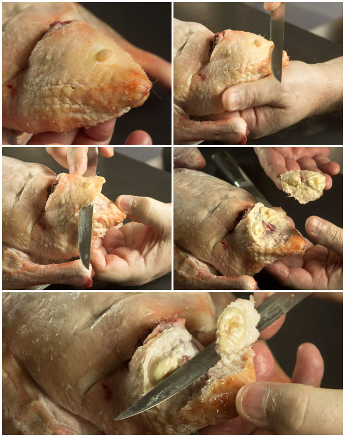 Η επόμενη δουλειά είναι το να κόψετε τις άκρες απ’ τις φτερούγες που θα χρησιμοποιηθούν στη σάλτσα και να αφαιρέσετε τον λαιμό που συνήθως είναι μέσα στη κοιλιακή κοιλότητα.Τα κρατάτε σε ένα πυρέξ.