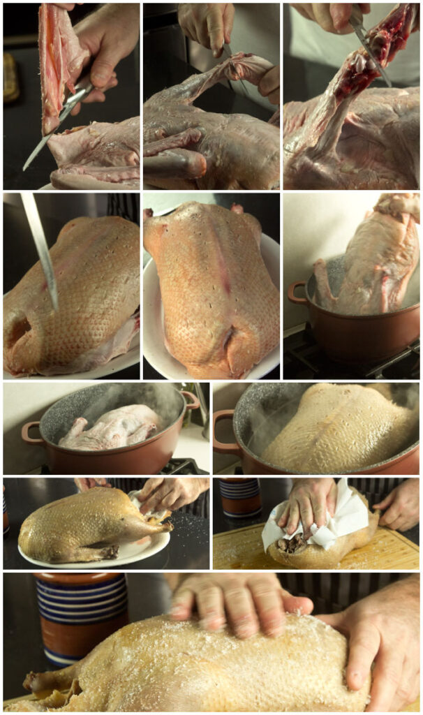 Η διαδικασία που ακολουθεί μας έχει έρθει από τις Κινέζικες τεχνικές για να πετύχουμε τραγανή πέτσα στη πάπια.Με μυτερό μαχαίρι κάντε πολλά μικρά τρυπήματα στο δέρμα του στήθους,χωρίς να περάσουν όμως στη σάρκα.Αυτά γίνονται προκειμένου να φεύγει σιγά-σιγά από εκεί το λίπος που θα λιώνει στο ψήσιμο.Στη συνέχεια εμβαπτίσετε την για 1 λεπτό από κάθε πλευρά,σε βραστό νερό,για να τεντώσετε τη πέτσα της.Σκουπίστε τη με χαρτί απ’ έξω και μέσα στη κοιλιακή χώρα και τρίψτε τη καλά με αλάτι γύρω-γύρω.Έτσι όπως είναι,στεγνή και αλατισμένη,βάλτε τη για μια ώρα στο ψυγείο να σφίξει και αφυγρανθεί όσο γίνεται η πέτσα,πριν την ψήσετε.