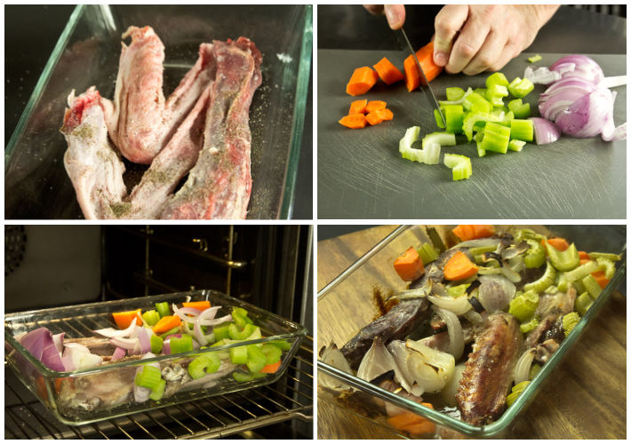 Αλατοπιπερίστε φτερούγες και λαιμό,βάλτε τα μέσα σε ένα ταψάκι και προσθέστε σέλερι,καρότο και κρεμμύδι,το γνωστό συνδυασμό «μιρεπουά».Τα αφήνετε στο φούρνο σε 200 °C πάνω-κάτω χωρίς υγρά,όση ώρα η πάπια είναι στο ψυγείο (κατά το μέγιστο 1 ώρα),να ανεβάσουν γεύσεις και να αφυγρανθούν,ώστε να είναι πιο ζωντανή η γευστική συμβολή τους στο ζωμό που θα φτιάξετε στη συνέχεια.