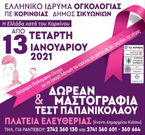 Μια προσφορά ζωής από το Δήμο μας και την ΠΕ Κορινθίας σε συνεργασία με το Ελληνικό Ίδρυμα Ογκολογίας,τον Ιατρικό Σύλλογο Κορινθίας και τηνμΙερά Μητρόπολη Κορίνθου.Οι κυρίες που επιθυμούν να εξεταστούν για τη μετακίνησή τους πρέπει να στείλουν τον κωδικό 1 στο 13033.
