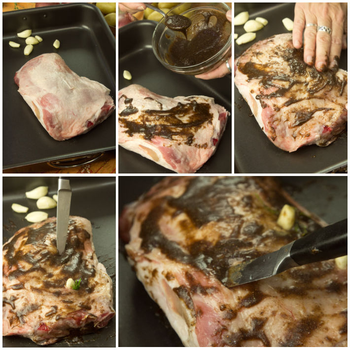 Βάλτε τη σπάλα σε ταψί και απλώστε γύρω της όλη τη πηχτή μαρινάδα.Στη συνέχεια κάντε κάποια κοψίματα στη σπάλα ώστε να βάλετε μέσα μερικές σκελίδες σκόρδο μαζί με μπουκετάκια δεντρολίβανο.