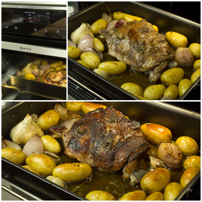 Βάζετε το ταψί στο φούρνο να ψηθεί στους 170°C,πάνω κάτω αντιστάσεις,για 2:30–3 ώρες.Κατά τα μέσα του χρόνου γυρνάτε τη σπάλα ανάποδα και ανακατεύετε τα λαχανικά.Προς το τέλος του χρόνου θα πρέπει οι πατάτες να έχουν πάρει χρώμα και το κρέας απ’ τη σπάλα να φεύγει εύκολα απ’ το κόκκαλο.