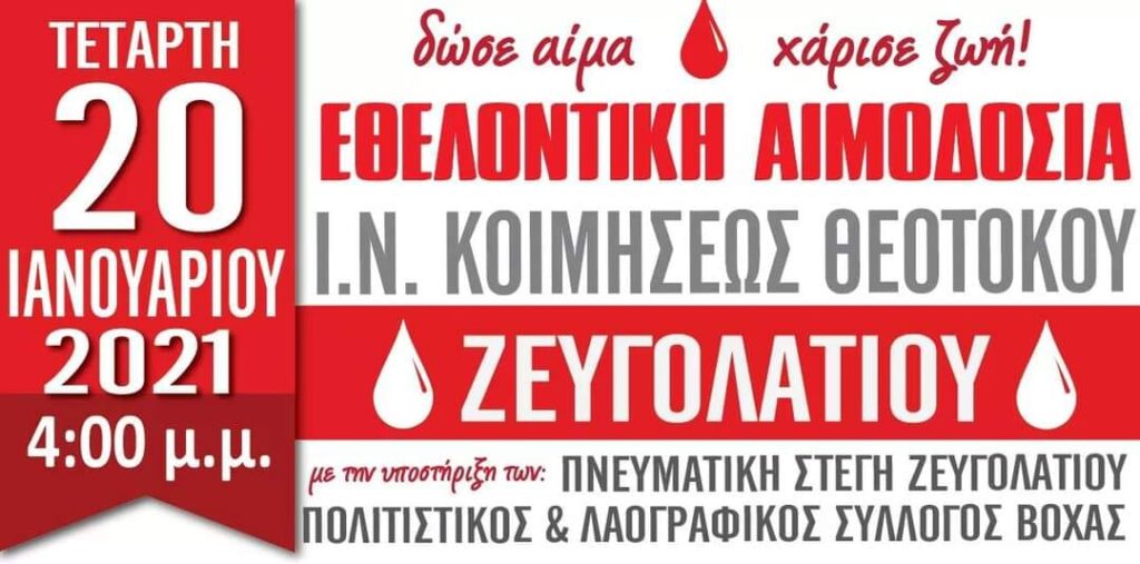 ShareTweet 0 Εθελοντική αιμοδοσία στον Ιερό Ναό Κοιμήσεως Θεοτόκου στο Ζευγολατιό. “Δώσε αίμα,χάρισε ζωή” πηγή: facebook