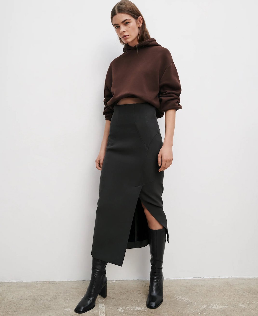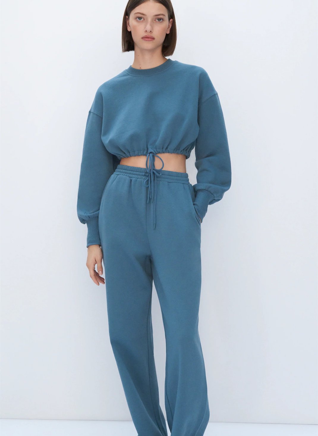 Το cropped σχήμα αναδεικνύει το πιο λεπτό σημείο του κορμού και αφήνει την σιλουέτα να «αναπνεύσει» πριν ξεκινήσει η ψηλόμεση baggy φόρμα.