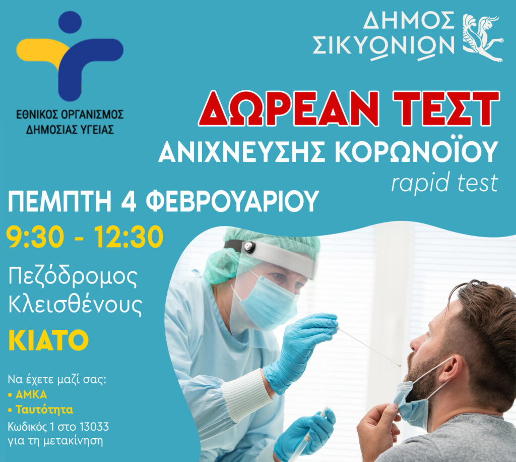 Ο Δήμος Σικυωνίων σε συνεργασία με τον ΕΟΔΥ πραγματοποιεί αύριο Πέμπτη 4 Φεβρουαρίου 2021 από ώρα 9:30 το πρωί έως 12:30 το μεσημέρι δωρεάν τεστ ανίχνευσης κορωνοϊού (rapid test). Το κλιμάκιο του ΕΟΔΥ θα βρίσκεται στην αρχή της οδού Κλεισθένους (πεζόδρομος) και οι ενδιαφερόμενοι πολίτες πρέπει να έχουν μαζί τους το ΑΜΚΑ, την Αστυνομική Ταυτότητά τους ή άλλο έγγραφο ταυτοποίησης ενώ για τη μετακίνησή τους θα απαιτηθεί να έχουν στείλει στο 13033 τον κωδικό 1.