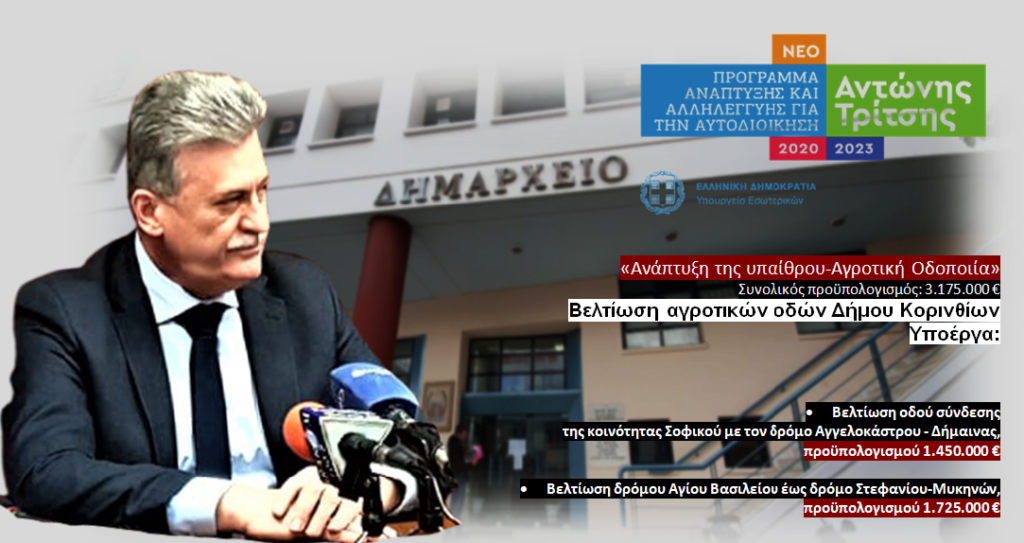 3.175.000 ευρώ από το «Αντώνης Τρίτσης για «Σοφικό – Αγγελόκαστρο – Δήμαινα» και «Άγ. Βασίλη – Στεφάνι – Μυκήνες» Υποβλήθηκε η 1η πρόταση του δήμου Κορινθίων στο  «Πρόγραμμα Ανάπτυξης και Αλληλεγγύης για την Τοπική Αυτοδιοίκηση «Αντώνης Τρίτσης»». Μετά από οργανωμένη και στοχευμένη εργασία των αρμοδίων υπηρεσιών και στελεχών κατατέθηκαν – στα πλαίσια της ΑΤ05 «Ανάπτυξη της Υπαίθρου – Αγροτική Οδοποιία»- προς χρηματοδότηση με το ποσό    των 3.175.000 δυο σημαντικότατα για το δήμο μας  έργα.