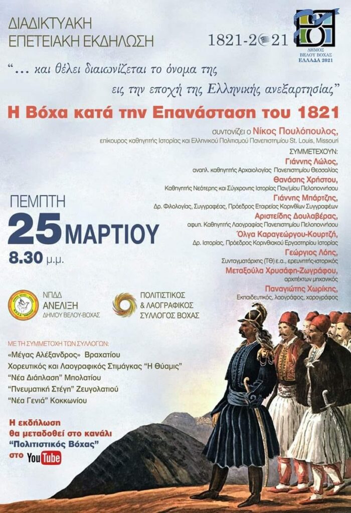 Για τον εορτασμό της 25ης Μαρτίου 2021 θα πραγματοποιηθεί διαδικτυακή επετειακή εκδήλωση που διοργανώνει ο Δήμος Βέλου Βόχας, το ΝΠΔΔ ΄΄ΑΝΕΛΙΞΗ΄΄ και ο Πολιτιστικός και Λαογραφικός Σύλλογος Βόχας με την συμμετοχή συλλόγων του Δήμου: