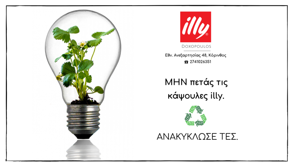 Με το σύνθημα αυτό, η εταιρεία Illy Doxopoulos σας προσκαλεί να συμμετάσχετε στην πρωτοβουλία της για ανακύκλωση των πλαστικών ή αλουμινένιων κάψουλων illy μετά την χρήση τους. Πλέον θα μπορείτε και εσείς να τις ανακυκλώσετε στους ειδικούς κάδους που έχουν τοποθετηθεί έξω από το κατάστημα της στην Εθνικής Ανεξαρτησίας 48 στην Κόρινθο. Για ένα πιο βιώσιμο μέλλον για την πόλη και τον πλανήτη μας! #OneMakesTheDifference #LIVEHAPPilly