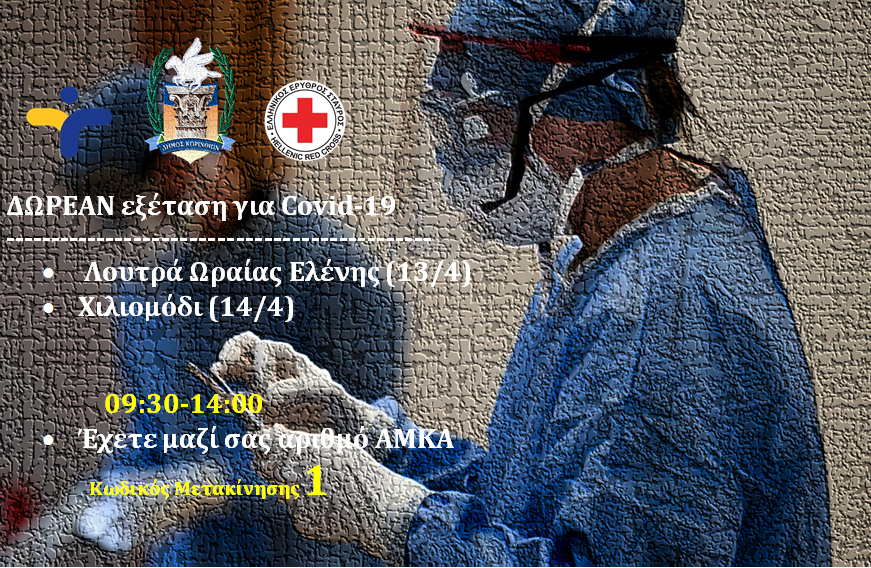 Ο Εθνικός Οργανισμός Δημόσιας Υγείας (ΕΟΔΥ) σε συνεργασία με τον Ερυθρό Σταυρό Κορίνθου και το Δήμο Κορινθίων, θα διεξάγουν δωρεάν ελέγχους ταχείας ανίχνευσης αντιγόνου (rapid test) Covid-19, στα Λουτρά Ωραίας Ελένης και στο Χιλιομόδι την Τρίτη 13 Απριλίου και την Τετάρτη 14 Απριλίου αντίστοιχα.