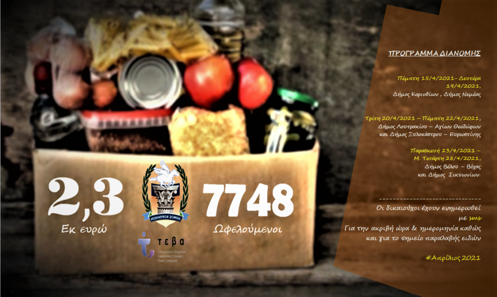 Το πρόγραμμα είναι ύψους 2,3 εκ ευρώ ,7.748 ωφελούμενοι των 5 δήμων της Κορινθίας, 2413 στο δήμο Κορινθίων, θα λάβουν από 14 Απριλίου 2021 έως και την Μεγάλη Τετάρτη 28 Απριλίου 2021 είδη πρώτης ανάγκης, τρόφιμα, καθαριστικά, είδη υγιεινής.