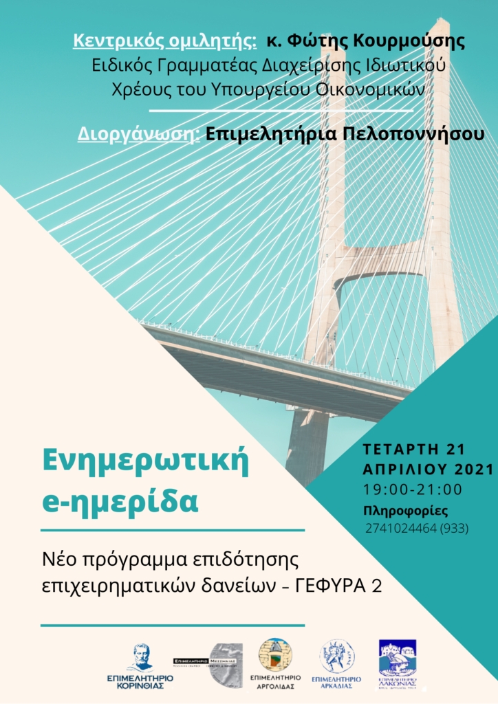 Το Περιφερειακό Επιμελητηριακό Συμβούλιο Πελοποννήσου σας προσκαλεί στην ενημερωτική τηλεδιάσκεψη με θέμα «Παρουσίαση του Νέου Προγράμματος Επιδότησης Επιχειρηματικών Δανείων – ΓΕΦΥΡΑ 2» η οποία θα πραγματοποιηθεί την Τετάρτη 21 Απριλίου 2021 και ώρα 19:00 μέσω της πλατφόρμας zoom.
