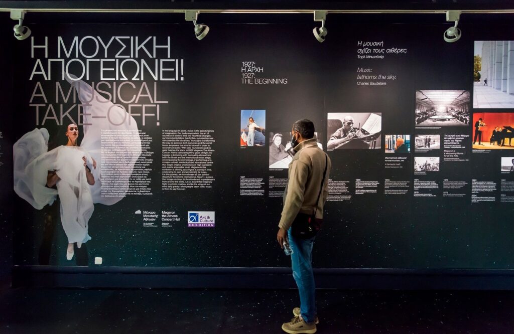 Εκτός από στιγμιότυπα παραστάσεων που άφησαν εποχή, η έκθεση περιλαμβάνει και εικόνες από διαλέξεις του Megaron Plus, από τη Μουσική Βιβλιοθήκη της Ελλάδος «Λίλιαν Βουδούρη», καθώς και ένα τρίλεπτο αναδρομικό βίντεο σε σκηνοθεσία Θωμά Κιάου, τα συνοδευτικά κείμενα της Μάιρας Μηλολιδάκη ή την ειδική φωτογράφιση κοστουμιών και αντικειμένων που έκανε ο Γιάννης Μπουρνιάς. Τον σχεδιασμό της έκθεσης ανέλαβε το γραφείο Post-Spectacular Office, ενώ την επιμέλεια εκ μέρους του αεροδρομίου είχε η Χαρά-Ελένη Μητσοτάκη.