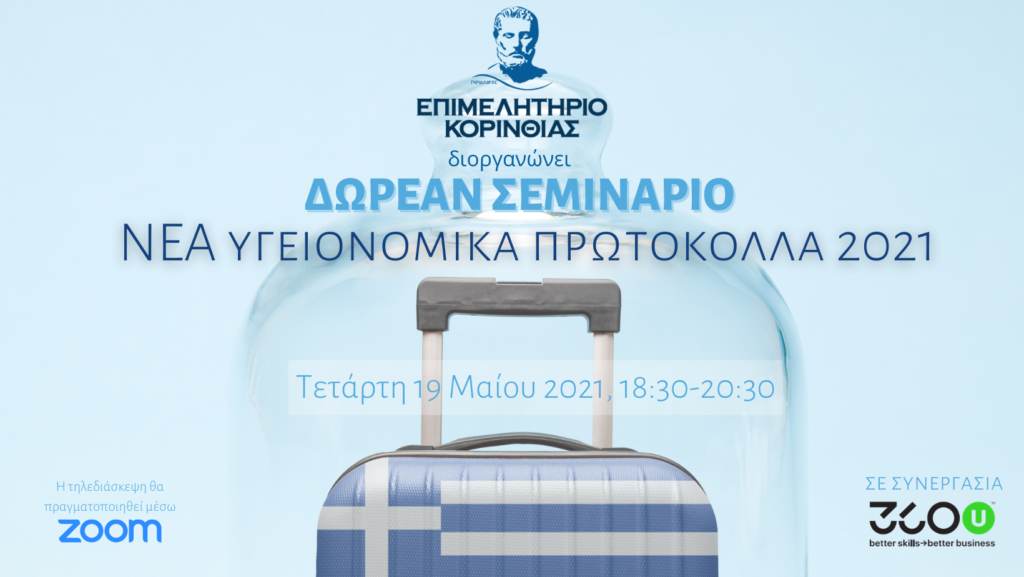 Το Επιμελητήριο Κορινθίας ενημερώνει τα μέλη του ότι προσφέρει ΔΩΡΕΑΝ τηλεκπαίδευση στα υγειονομικά πρωτόκολλα σύμφωνα με την ΚΥΑ «Ειδικά πρωτόκολλα υγειονομικού περιεχομένου βάσει των οποίων λειτουργούν οι τουριστικές επιχειρήσεις στο πλαίσιο της λήψης μέτρων έναντι του κορωνοϊού COVID-19» (Β’ 2084), Α.Π. 1632/21.5.2021.