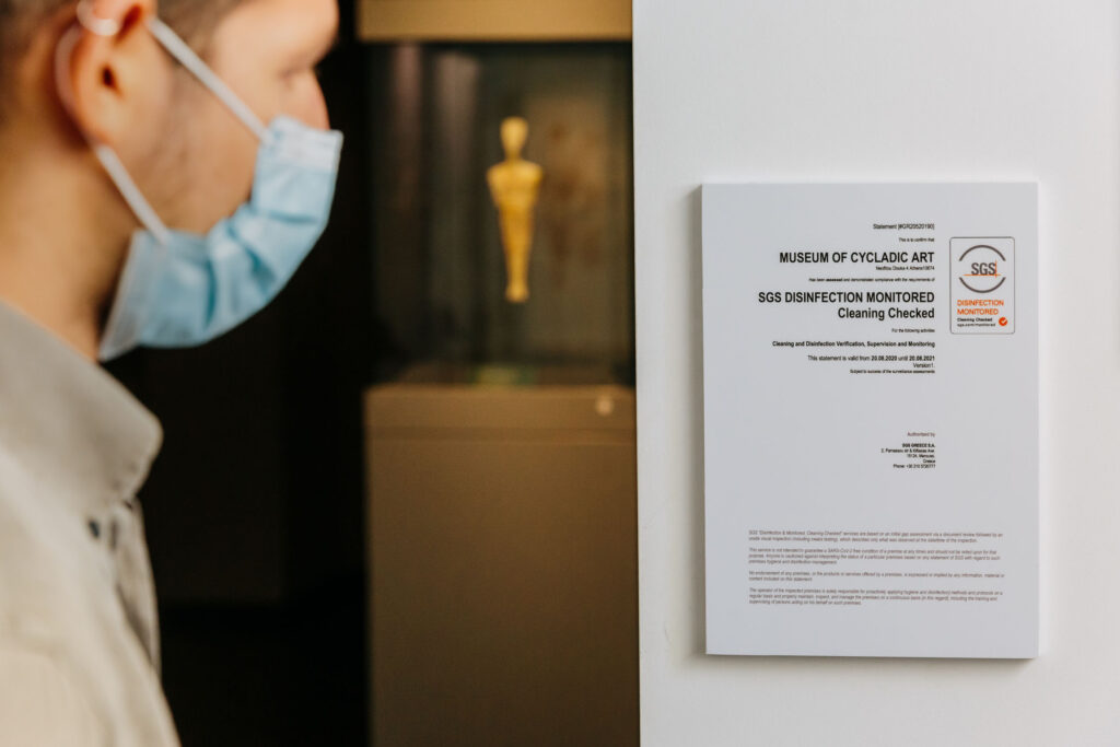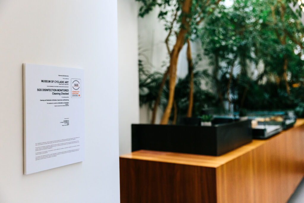 Το Μουσείο Κυκλαδικής Τέχνης ανοίγει τις πόρτες του στο κοινό, εφαρμόζοντας όλα τα απαραίτητα μέτρα για την εύρυθμη και ασφαλή λειτουργία του. Υπενθυμίζεται πως, πέρα των προβλεπόμενων μέτρων, συνεργάζεται με την εταιρία επιθεωρήσεων, πιστοποιήσεων και ελέγχων SGS και έχει λάβει το ειδικό σήμα που πιστοποιεί την αποτελεσματικότητα των διαδικασιών καθαρισμού και απολύμανσης (περιλαμβανομένου του ιού SARS-CoV-2 / Covid-19) σε όλους τους χώρους του. Η SGS είναι η μεγαλύτερη εταιρία επιθεωρήσεων, επιβλέψεων, επαληθεύσεων, εργαστηριακών αναλύσεων και πιστοποιήσεων παγκοσμίως που στην Ελλάδα δραστηριοποιείται από το 1933.