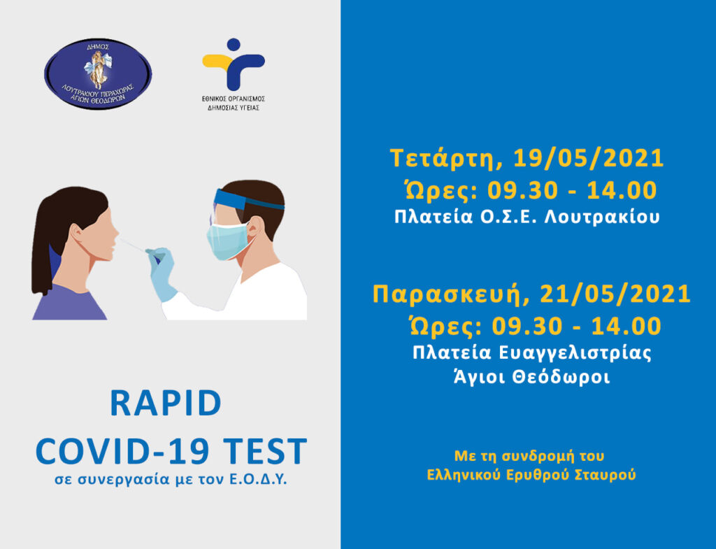Ο Εθνικός Οργανισμός Δημόσιας Υγείας (ΕΟΔΥ) σε συνεργασία με τον Ελληνικό Ερυθρό Σταυρό πτ Κορίνθου, τον Ελληνικό Ερυθρό Σταυρό Παράρτημα Αγίων Θεοδώρων και τον Δήμο Λουτρακίου – Περαχώρας – Αγίων Θεοδώρων θα διεξάγουν δωρεάν ελέγχους ταχείας ανίχνευσης αντιγόνου (rapid test) Covid-19, σε σημεία του Δήμου.