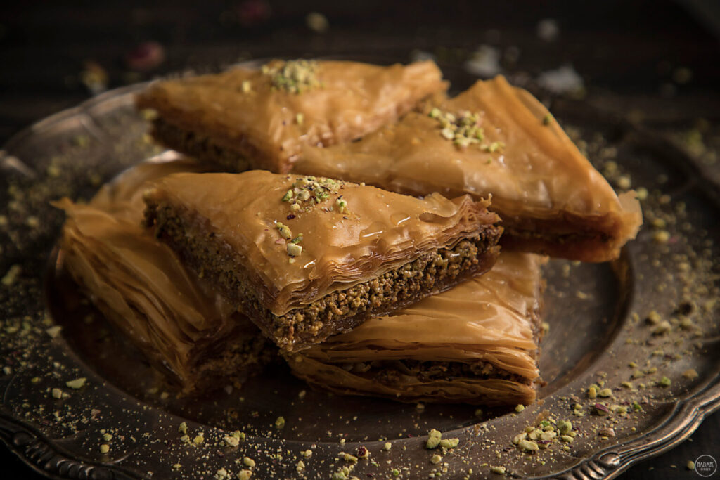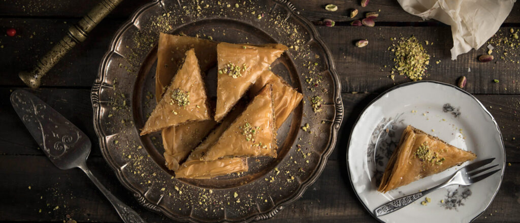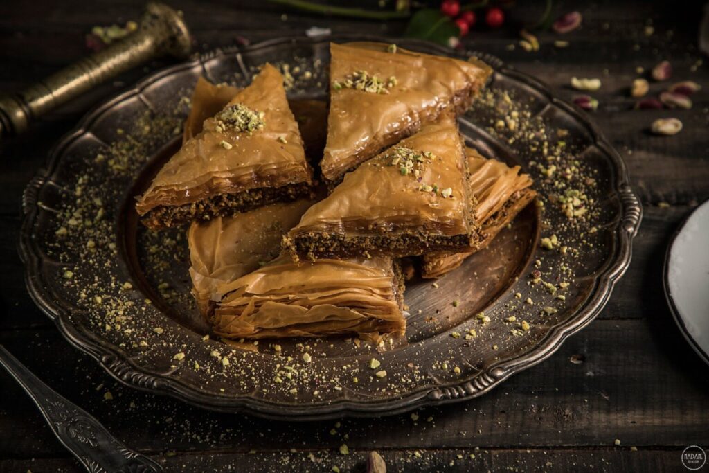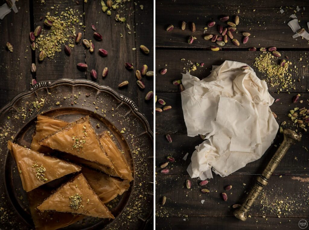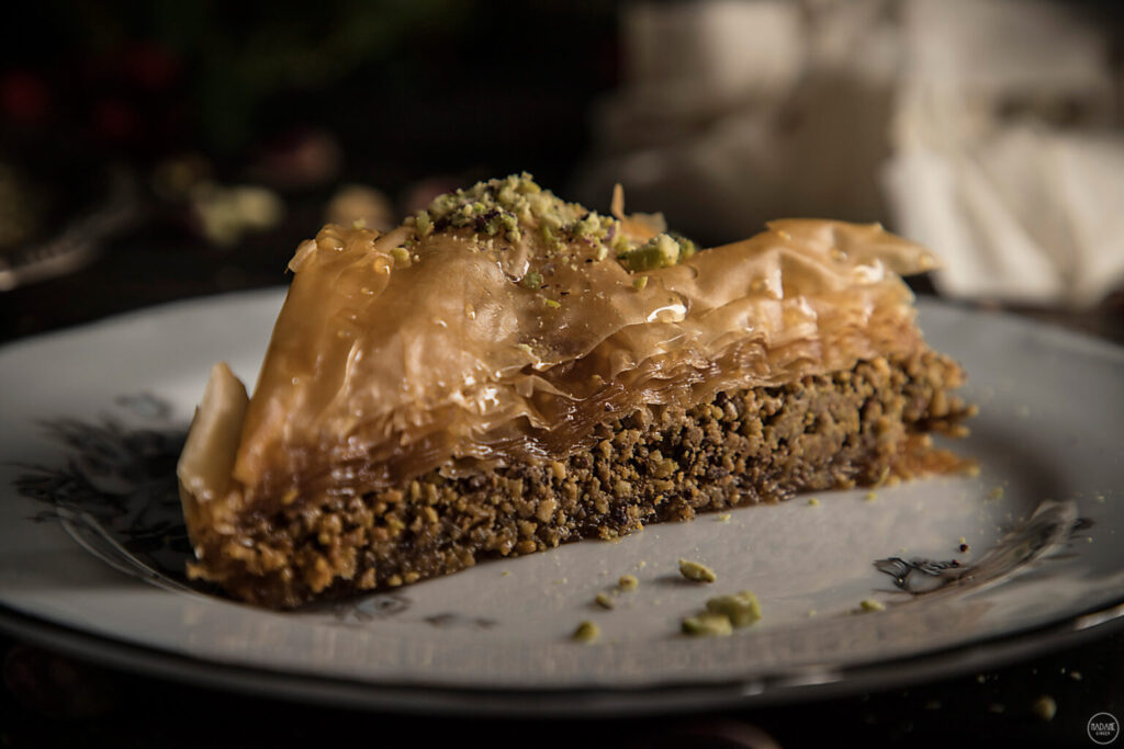 Ο δικός μου μπακλαβάς, έχει φυστίκι Αιγίνης που το κάνω πούδρα με μεταλλικές λεπίδες. Το φύλλο του είναι αεράτο, τραγανό, μοσχοβολάει βούτυρο αιγοπρόβειο.Φύλλο Βυρητού “πολίτικό” της alfa, μόνο με αυτό μου βγήκε όπως ήθελα. Ο δικός μου ο μπακλαβάς, έχει ελάχιστο σιρόπι, ίσα-ίσα να πιάνει τα κάτω φύλλα και να ενώνει τη γέμιση.