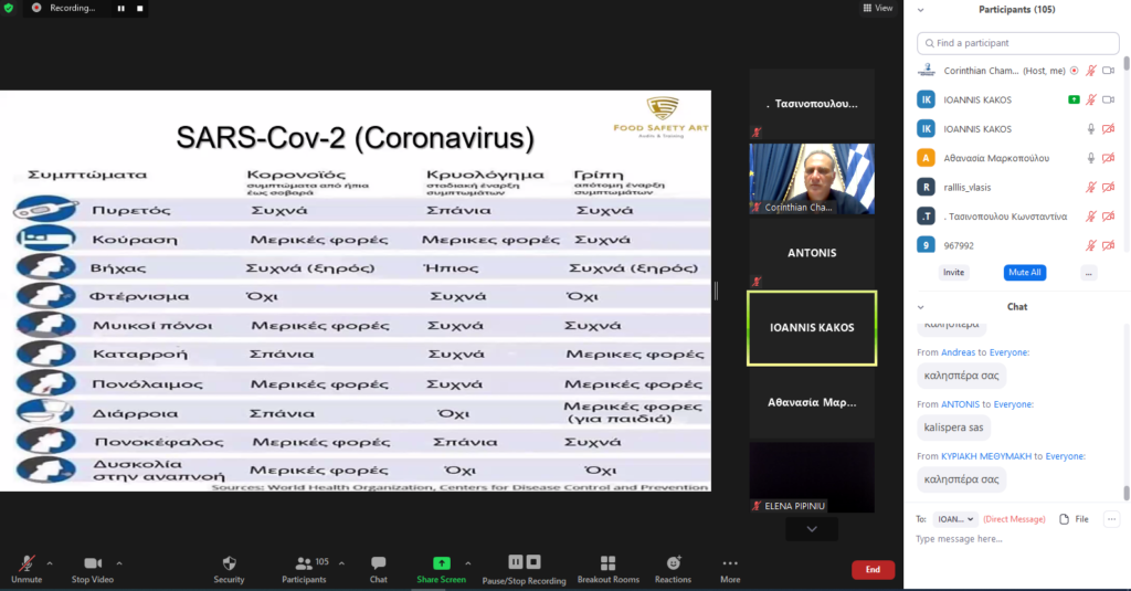 Ο Πρόεδρος του Επιμελητηρίου Κορινθίας, κ. Παναγιώτης Πιτσάκης καλωσόρισε τους επαγγελματίες του τουρισμού με ένα σύντομο χαιρετισμό και τόνισε ότι όπως και πέρσι έτσι και φέτος θα πρέπει να αξιοποιηθούν όλα τα υγειονομικά όπλα και εργαλεία που έχουμε στα χέρια μας για να ξεκινήσει ο τουρισμός στην περιοχή μας με τις καλύτερες δυνατές προδιαγραφές. Για τα Υγειονομικά Πρωτόκολλα στα τουριστικά καταλύματα μίλησε ο τεχνολόγος Τροφίμων & Ποτών Msc και εισηγητής εκπαιδευτικών προγραμμάτων ΕΦΕΤ, κ. Ιωάννης Κακός δίνοντας τις κατάλληλες οδηγίες για τον τρόπο ανάπτυξης και εφαρμογής τους με βάση τη νέα ΚΥΑ.