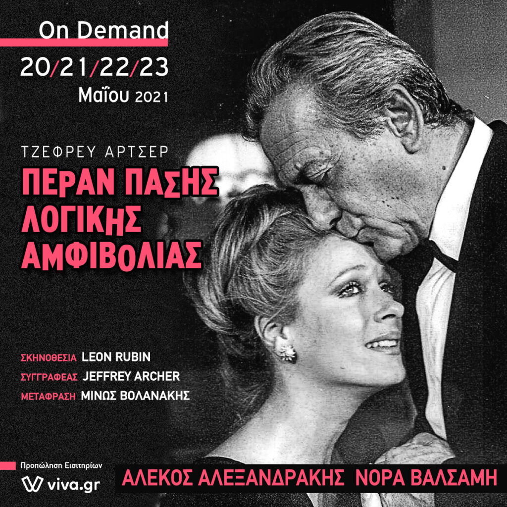 « Πέραν πάσης λογικής αμφιβολίας » του Τζέφρευ Άρτσερ. Το θεατρικό έργο που πρωτοπαίχτηκε στην Ελλάδα το 1988 με 1989, στο θέατρο Αλίκη, από τον Αλέκο Αλεξανδράκη και την Νόρα Βαλσάμη, με τεράστια επιτυχία, έρχεται on demand στις 20,21,22 και 23 Μαΐου από το viva.gr. To αστυνομικό θρίλερ, σε μετάφραση του Μίνωα Βολανάκη και σκηνοθεσία του Leon Rubin, είναι ένα δικαστικό δράμα που κρατάει τον θεατή σε αγωνία μέχρι την τελευταία στιγμή. Αγωνία, δράμα, πλοκή, χιούμορ, σεβασμός, αγάπη, είναι τα κύρια χαρακτηριστικά του. Το έργο παρουσιάζει ιδιαίτερο ενδιαφέρον γιατί πραγματεύεται ένα ιδιαίτερο κοινωνικό θέμα, την ευθανασία. Η παράσταση σημείωσε μεγάλη καλλιτεχνική και εμπορική επιτυχία. Ανέβηκε ξανά στο θέατρο Λαμπέτη με τον Γρηγόρη Βαλτινό και την Κοραλία Καράντη, δέκα χρόνια αργότερα, σε μετάφραση Μίνωα Βολανάκη, σκηνοθεσία Γρηγόρη Βαλτινού και παραγωγή Γιώργου Λεμπέση.