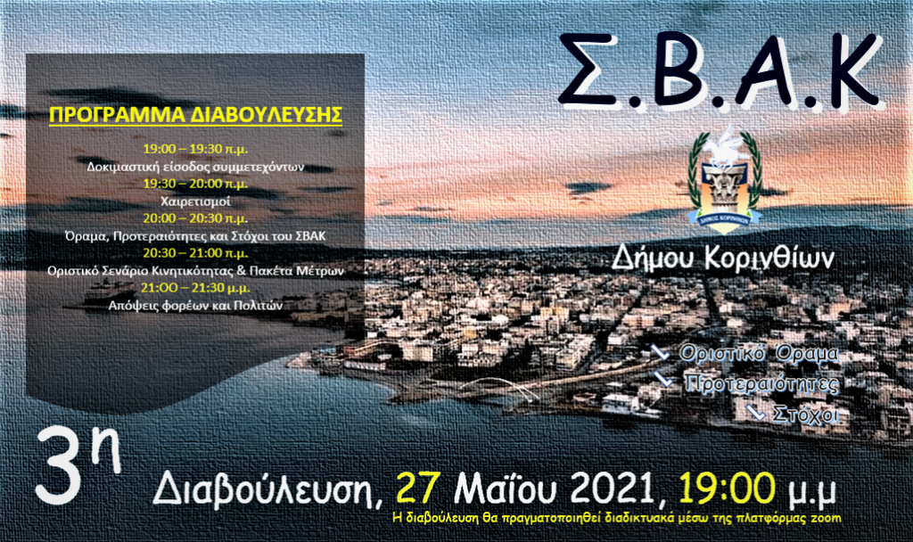 Ο Δήμος Κορινθίων σας καλεί στην τρίτη διαβούλευση για το υπό εκπόνηση Σχέδιο Βιώσιμης Αστικής Κινητικότητας. Λόγω των συνθηκών η διαβούλευση θα πραγματοποιηθεί διαδικτυακά μέσω της πλατφόρμας zoom την Πέμπτη 27/052021 και ώρα 19.00μμ.