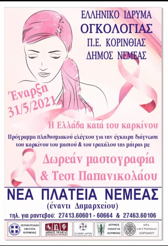 Στο πλαίσιο του προγράμματος πληθυσμιακού ελέγχου «Η ΕΛΛΑΔΑ ΚΑΤΑ ΤΟΥ ΚΑΡΚΙΝΟΥ», που πραγματοποιεί το Ελληνικό Ίδρυμα Ογκολογίας για την πρόληψη και έγκαιρη διάγνωση του καρκίνου του μαστού και του τραχήλου της μήτρας, και μετά από αίτημα της Περιφερειακής Ενότητας Κορινθίας το οποίο έγινε αποδεκτό, ξεκινά πρόγραμμα πληθυσμιακού ελέγχου για όλες τις γυναίκες που κατοικούν μόνιμα στον Δήμο για  μαστογραφία και τεστ Παπανικολάου, υπό την Αιγίδα της Περιφέρειας Πελοποννήσου. Οι εξετάσεις παρέχονται, όπως πάντα, εντελώς ΔΩΡΕΑΝ χωρίς οικονομικά, ασφαλιστικά ή φορολογικά κριτήρια.