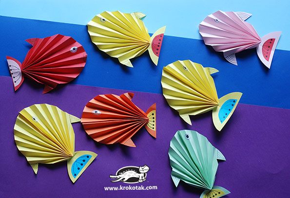 Πάρτε ένα από τα χρωματιστά χαρτιά και διπλώστε το στη μέση. Πάρτε ένα μολύβι και σχεδιάστε το περίγραμμα του ψαριού και μετά κόψτε το με το ψαλίδι. Στη συνέχεια ανοίξτε πάλι διάπλατα το χαρτί, αρχίστε να το διπλώνετε σαν ακορντεόν μέχρι την ουρά του ψαριού και μόλις τελειώσετε ενώστε τις 2 άκρες με κόλλα. Τέλος με μαρκαδόρους και ότι άλλο θελήσετε, μπορείτε να στολίσετε τις ουρίτσες από τα ψαράκια σας και να ζωγραφίσετε ένα ματάκι στο κάθε ψάρι.