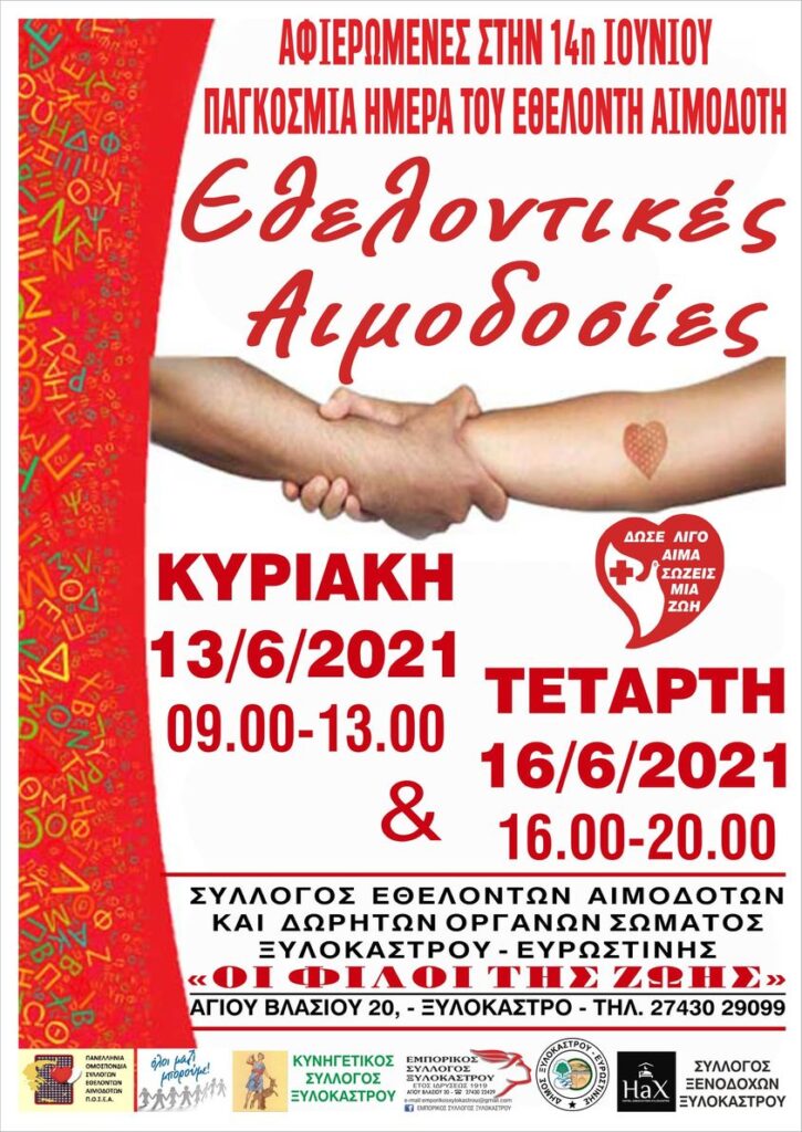 Σε αυτή τη δύσκολη συγκυρία και στα πλαίσια της Παγκόσμιας Ημέρας του Εθελοντή Αιμοδότη, ο Σύλλογός Εθελοντών Αιμοδοτών και Δωρητών Οργάνων Σώματος Ξυλοκάστρου-Ευρωστίνης «ΟΙ ΦΙΛΟΙ ΤΗΣ ΖΩΗΣ» απευθύνει κάλεσμα για Αιμοδοσία στα Γραφεία του Συλλόγου, Αγ. Βλασίου 20, στο Ξυλόκαστρο.