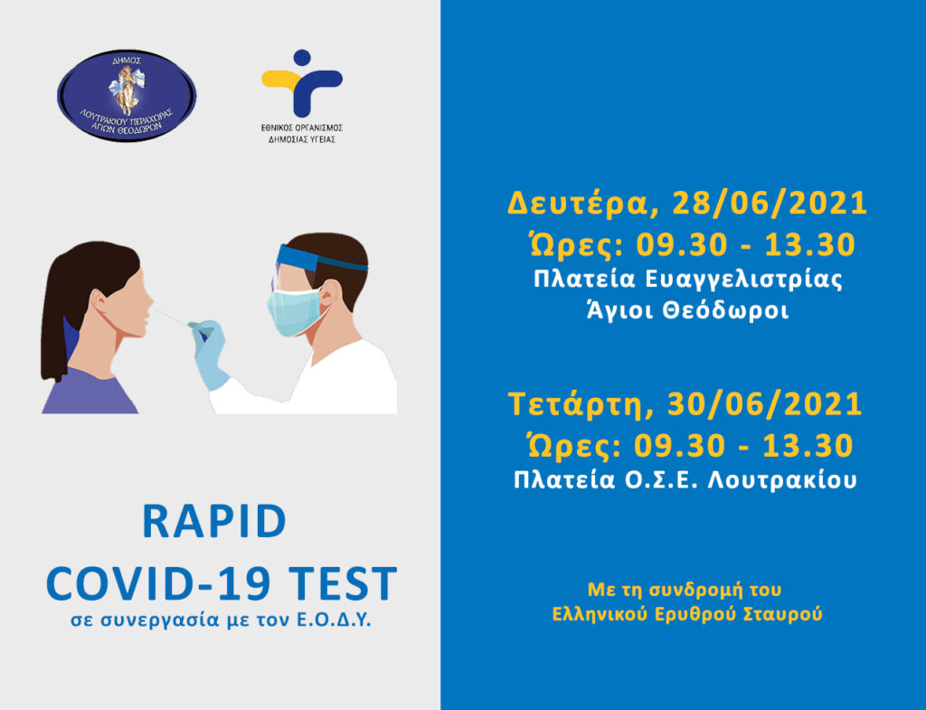 Ο Εθνικός Οργανισμός Δημόσιας Υγείας (ΕΟΔΥ) σε συνεργασία με τον Ελληνικό Ερυθρό Σταυρό πτ Κορίνθου, τον Ελληνικό Ερυθρό Σταυρό Παράρτημα Αγίων Θεοδώρων και τον Δήμο Λουτρακίου – Περαχώρας – Αγίων Θεοδώρων θα διεξάγουν δωρεάν ελέγχους ταχείας ανίχνευσης αντιγόνου (rapid test) Covid-19, σε σημεία του Δήμου.