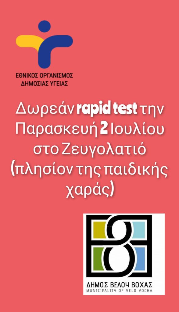 ShareTweet 0 Αύριο 02 Ιουλίου στο Ζευγολατιό πλησίον της παιδικής χαράς δωρεάν rapid test. Οι ενδιαφερόμενοι πρέπει να έχουν μαζί τους το ΑΜΚΑ
