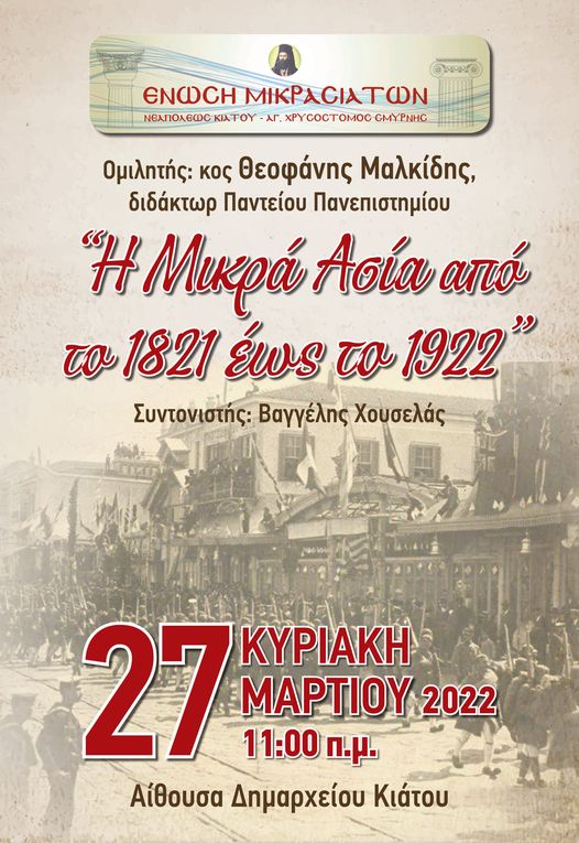 Η Ένωση Μικρασιατών Νεάπολης Κιάτου παρουσιάζει την Κυριακή 27 Μαρτίου και ώρα 11,00 π.μ., στην Αίθουσα του δημαρχείου Κιάτου, την Εκδήλωση “Η ΜΙΚΡΑ ΑΣΙΑ ΑΠΟ ΤΟ 1821 ΕΩΣ ΤΟ 1922” με Ομιλητή τον ΔΡ ΘΕΟΦΑΝΗ ΜΑΛΚΙΔΗ.