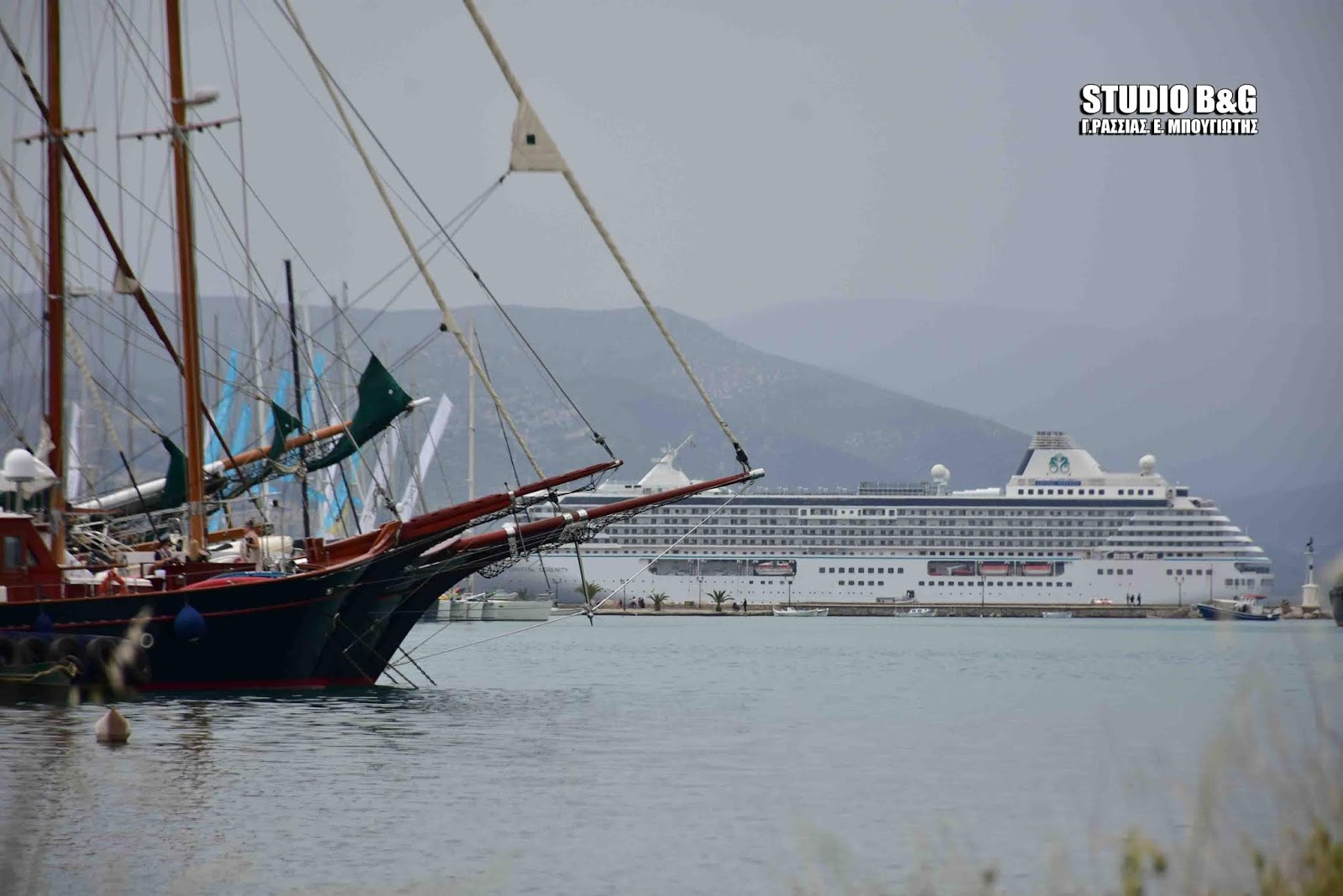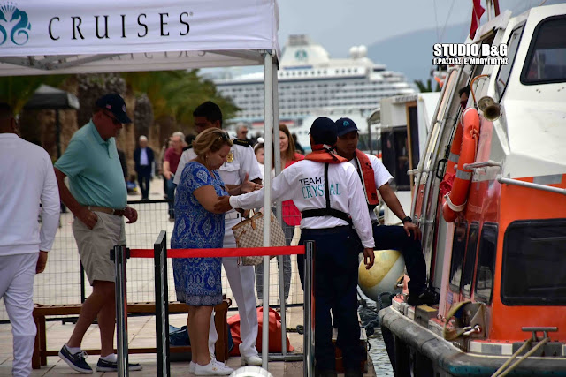 Το Crystal Serenity με σημαία Μπαχάμες αφίχθη σήμερα Κυριακή 5 Μαΐου 2019 στο Ναύπλιο και βρίσκεται αρόδο ανοιχτά του Αργολικού κόλπου, την στιγμή που στην πόλη βρίσκεται σε εξέλιξη το 6ο Mediterranean Yacht Show με περισσότερα από 120 υπερπολυτελή σκάφη.