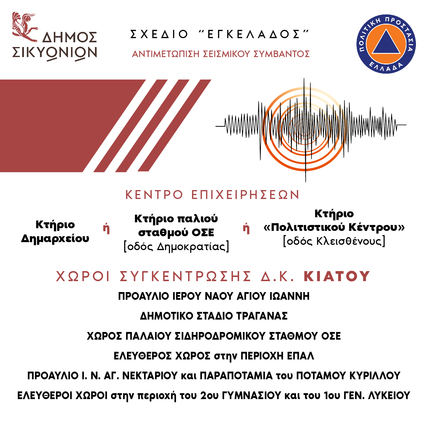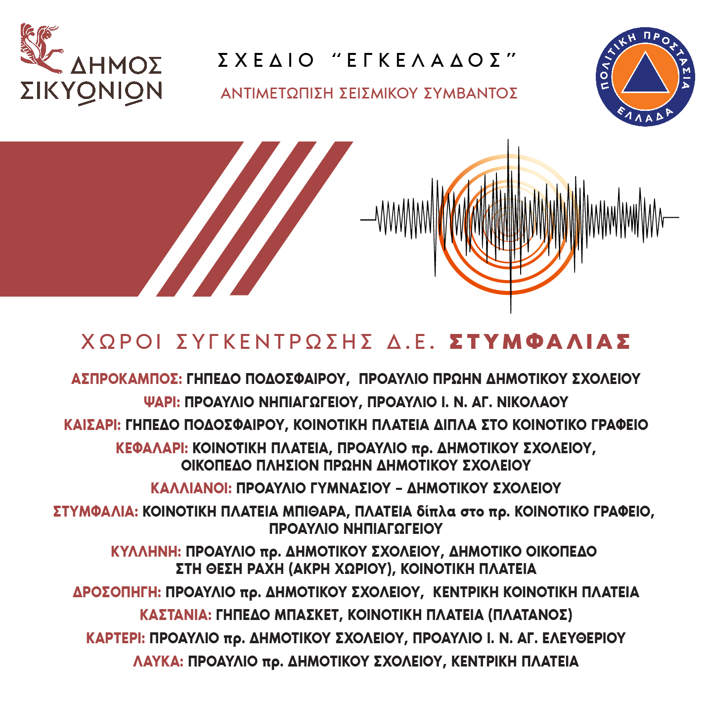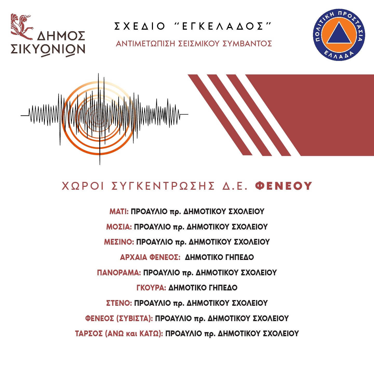 Ο δήμος Σικυωνίων έχει ήδη εκπονήσει πλήρες σχέδιο αντιμετώπισης σεισμικού συμβάντος, στο πλαίσιο του προγράμματος ΕΓΚΕΛΑΔΟΣ, το οποίο έχει επικαιροποιηθεί και ψηφιστεί από το Δημοτικό Συμβούλιο, πρόσφατα. Επίσης φρόντισε έγκαιρα και εξασφάλισε χρηματοδότηση από το πρόγραμμα «Αντώνης Τρίτσης» για τον προσεισμικό έλεγχο σχολείων και δημοτικών κτηρίων, που έχει ολοκληρωθεί. Στο αμέσως επόμενο χρονικό διάστημα, μάλιστα, έχουν προγραμματιστεί ασκήσεις σεισμού και ενημερωτικές εκδηλώσεις για τους μαθητές αλλά και γενικότερα τους κατοίκους του δήμου και στις τρεις δημοτικές ενότητες (Σικυωνίων, Στυμφαλίας και Φενεού).