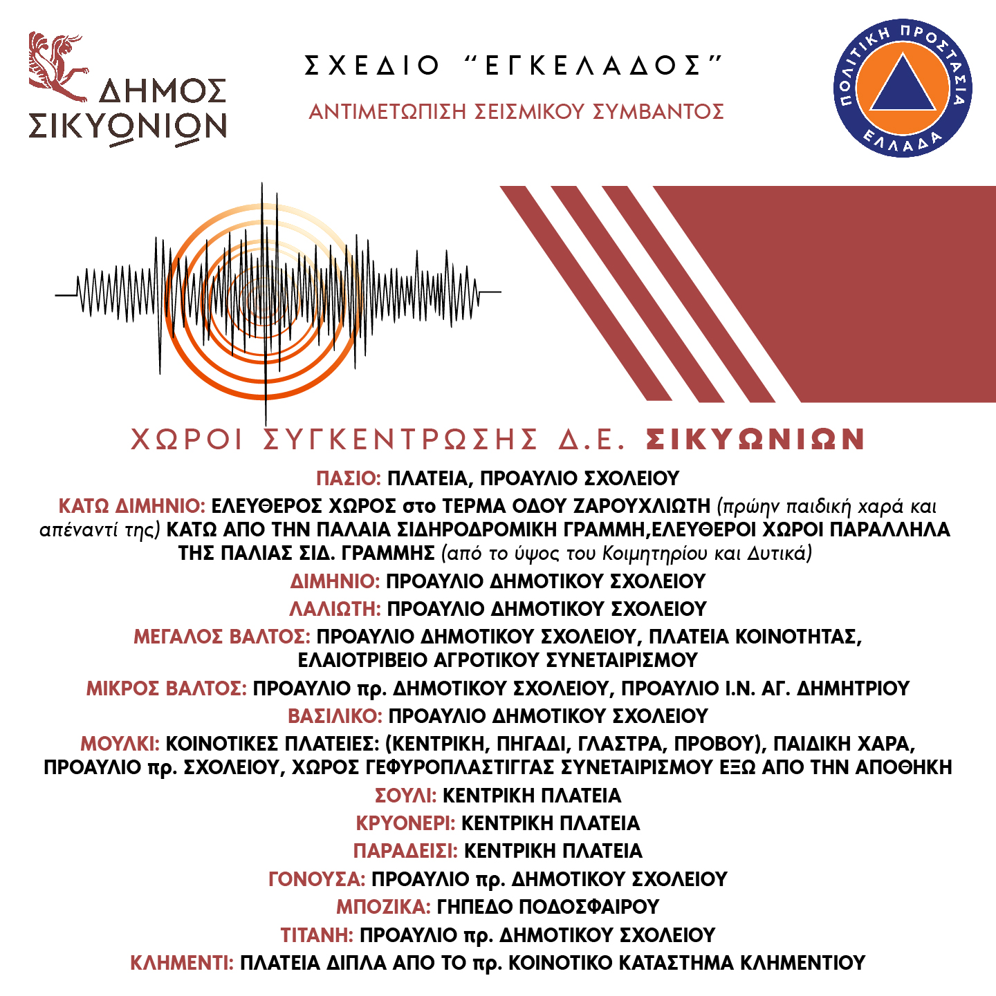 Στο πλαίσιο της ενημέρωσης των κατοίκων και επισκεπτών του δήμου μας, δημοσιοποιούμε τα σημεία συγκέντρωσης σε περίπτωση σεισμικού συμβάντος και παρακαλούμε τους δημότες να κάνουν έλεγχο των οικοδομών τους και της στατικότητας των κτηρίων, καθώς και επιμελή έλεγχο της εσωτερικής διαρρύθμισης της οικίας τους σύμφωνα με τις οδηγίες του ΟΑΣΠ (https://www.oasp.gr/inform/general_population).